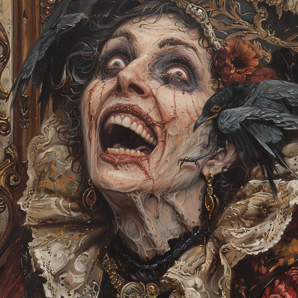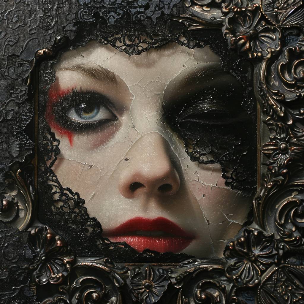 Une peinture à l'huile représentant le véritable mal, avec des détails trompe-l’œil illusionnistes et un style gothique sombre et orné.