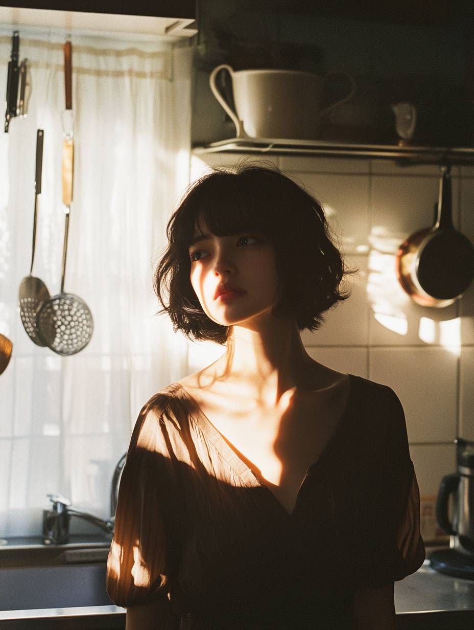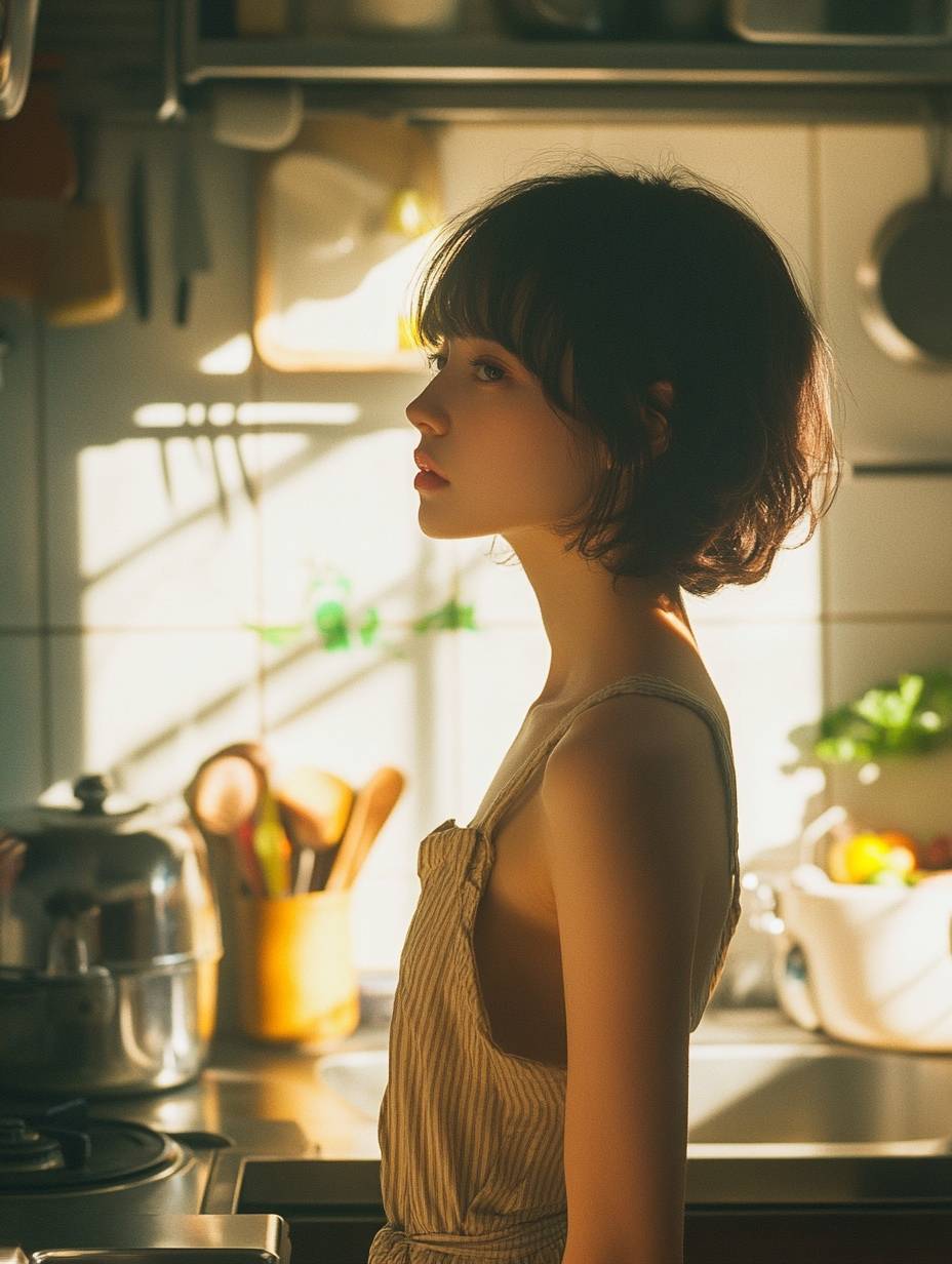 Beauté aux cheveux courts, séance photo quotidienne à la maison, photographie sur film, style photographique de Renko Kawauchi, portrait à mi-hauteur, cuisine, affichage des ustensiles de cuisine en arrière-plan, lumière estivale, haut contraste, ombre, ton Kodak,
