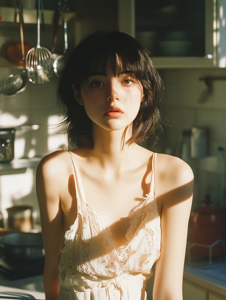 Short-haired beauty, daily sling at home, film photography, Renko Kawauchi photography style, half-length portrait, kitchen, kitchen utensils background display, summer sunshine, high contrast, shadow, Kodak tone, --ar 3:4 --v 6.1