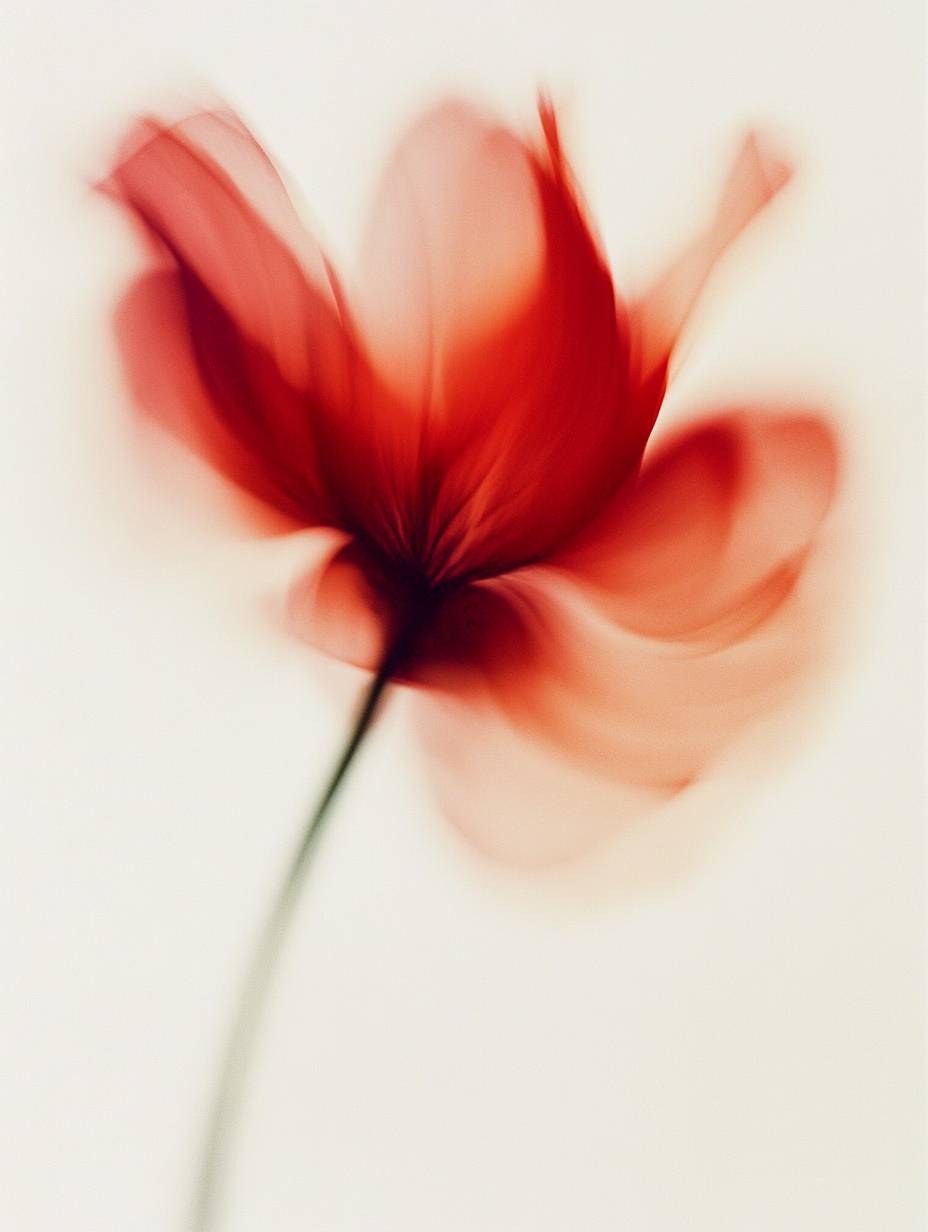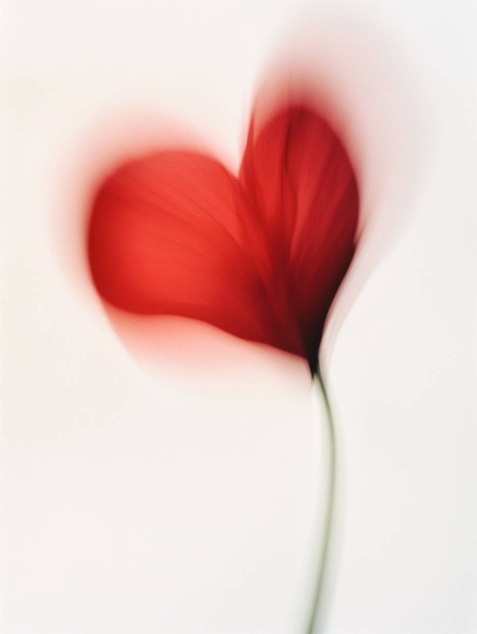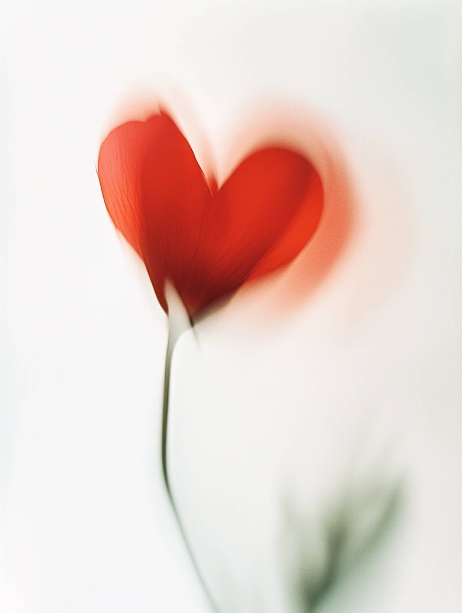 Une fleur rouge floue en forme de cœur en mouvement sur fond blanc, capturée dans le style de Peter Lindbergh avec un film Kodak Portra 800, avec un éclairage doux et un faible contraste.