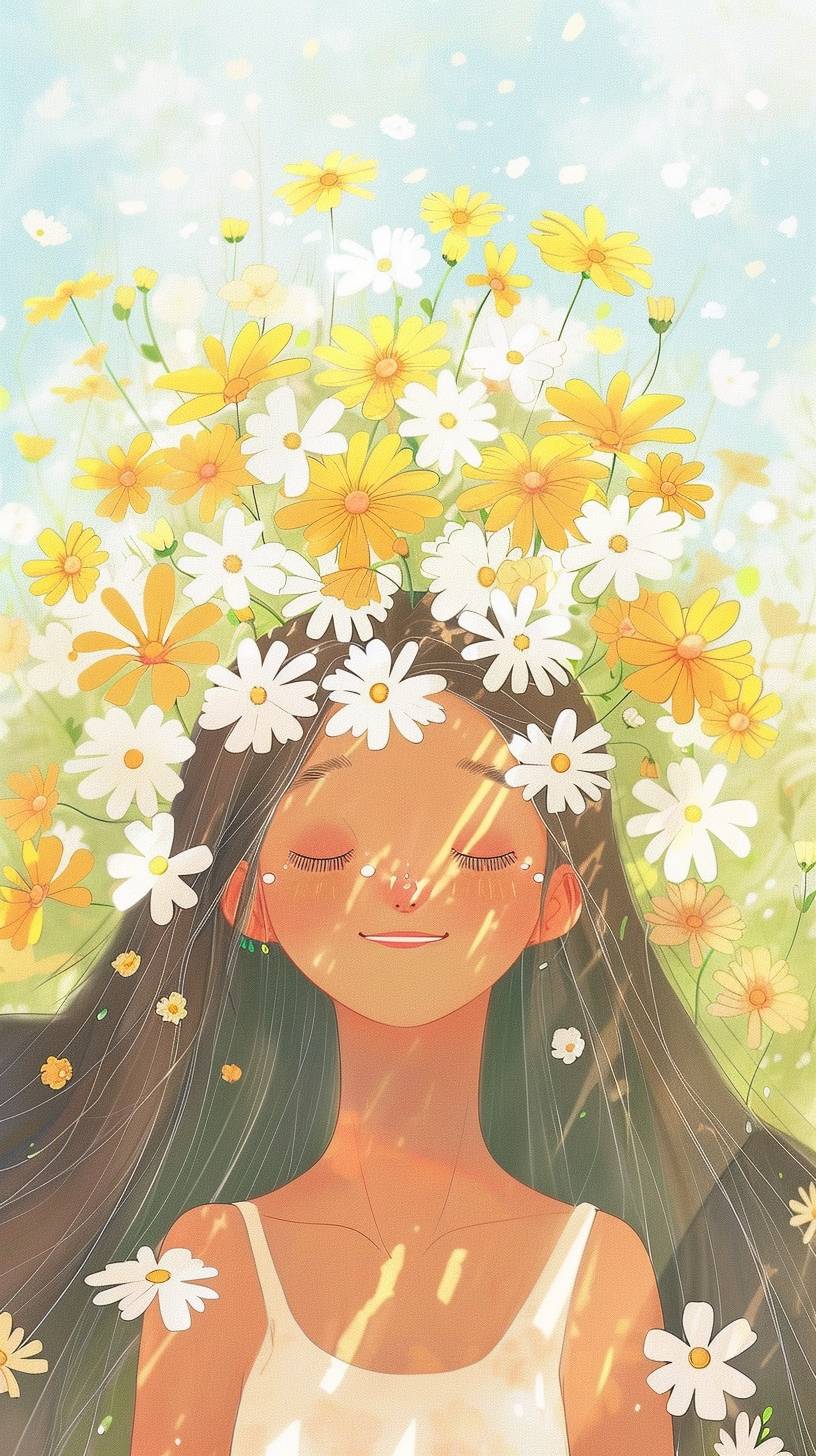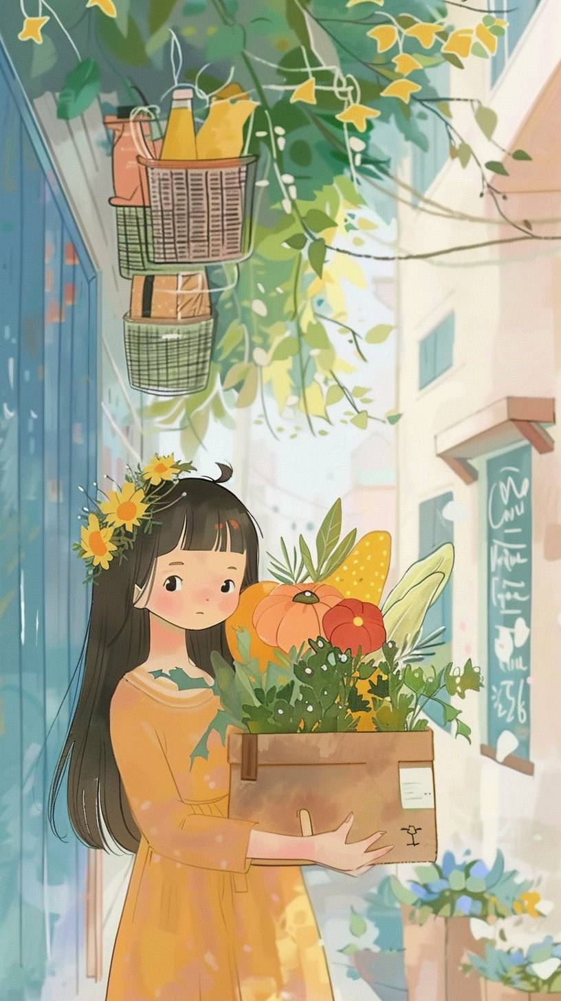 Une fille adorable dans un style chaleureux et apaisant, avec des tons de blanc profond et de vert clair, un design plat minimaliste, et un style artistique créatif pour les courses.