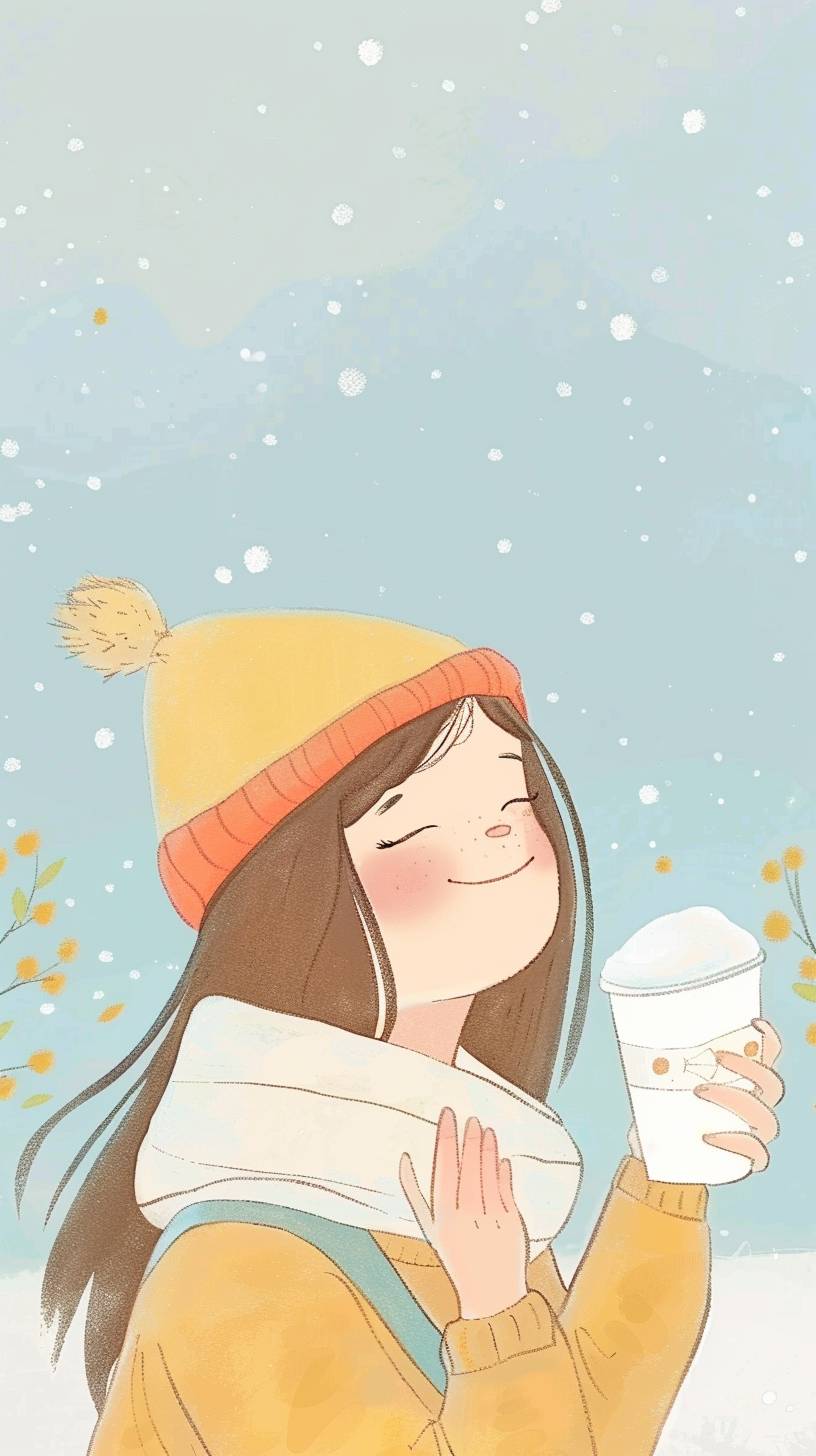 Une fille mignonne dans un style chaleureux et apaisant, des tons de blanc profond et de vert clair, un design minimaliste et plat, un cadeau animé, beige clair, des formes douces et arrondies, un style artistique créatif de produits d'épicerie
