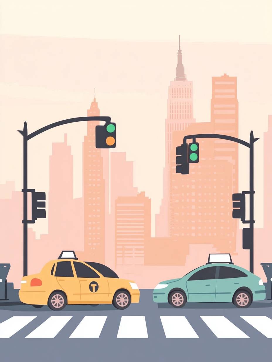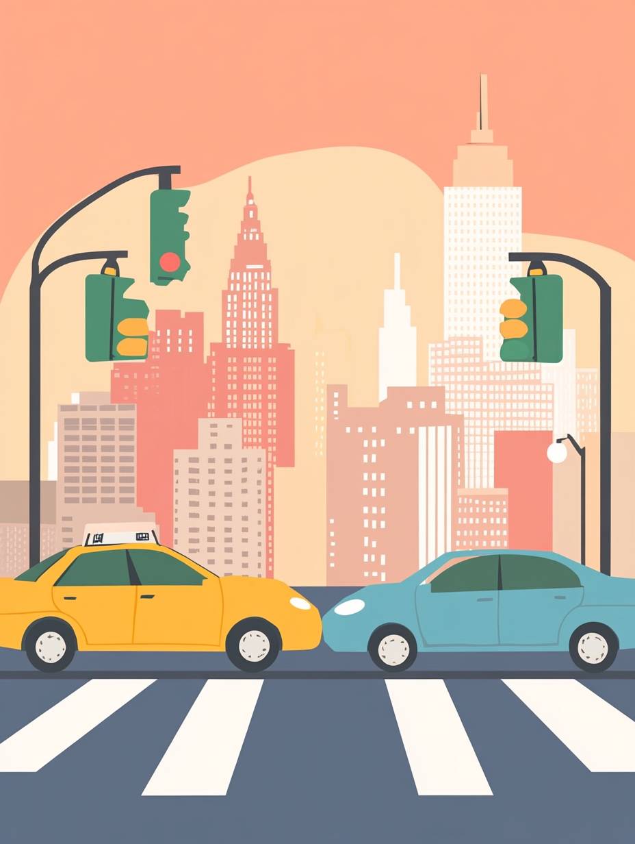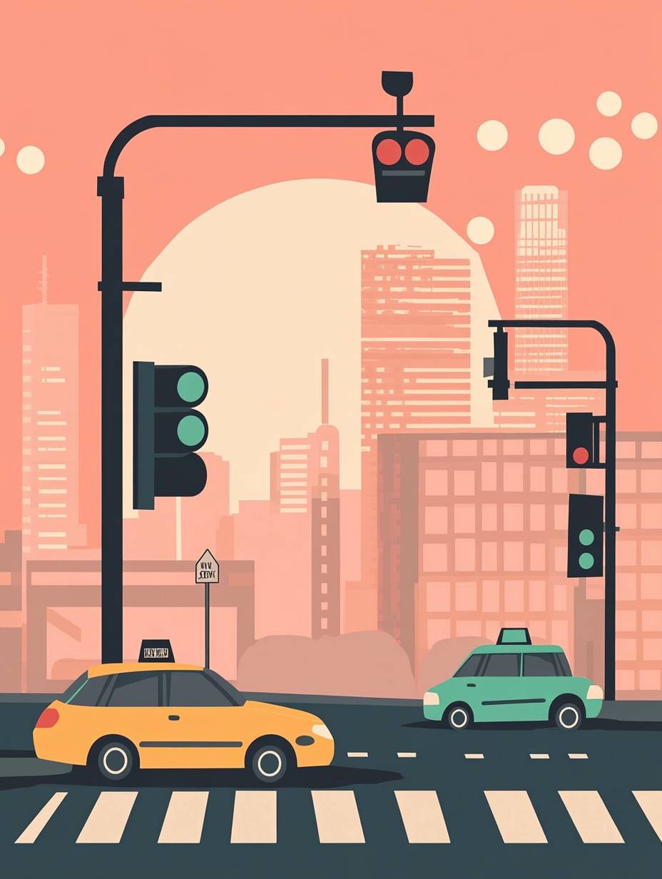 Flat vector illustration of cars at an intersection with traffic lights and city skyline in the background, simple flat design, pastel color palette, muted tones, orange-pink sky, cute style, cute cartoon car graphics, cute yellow car on the left side next to a green light, cute blue cab behind it, white street sign in front of a wall with black circles. Large areas of white space. --ar 3:4 --stylize 70 --v 6.1