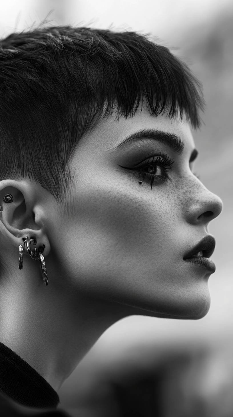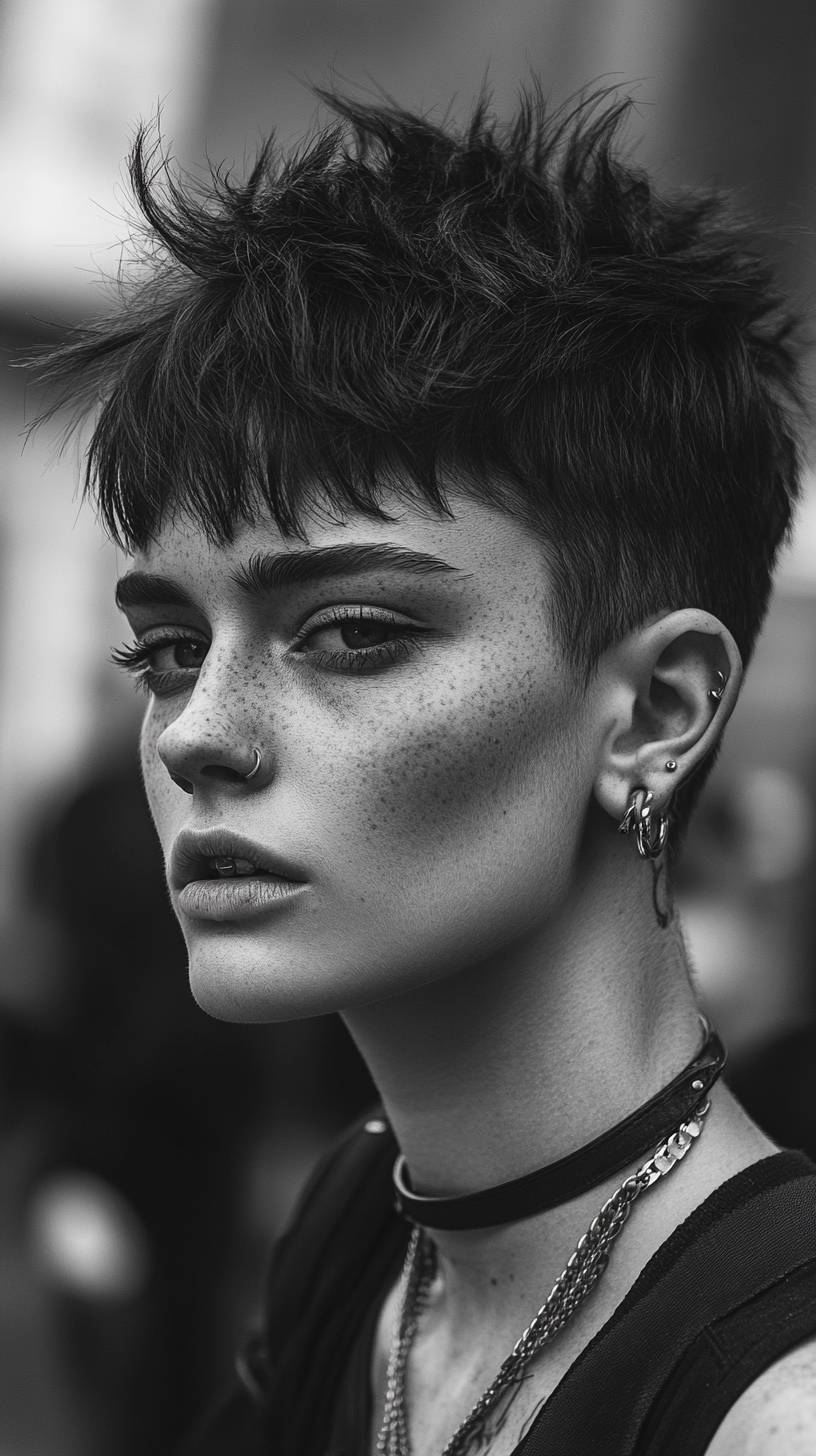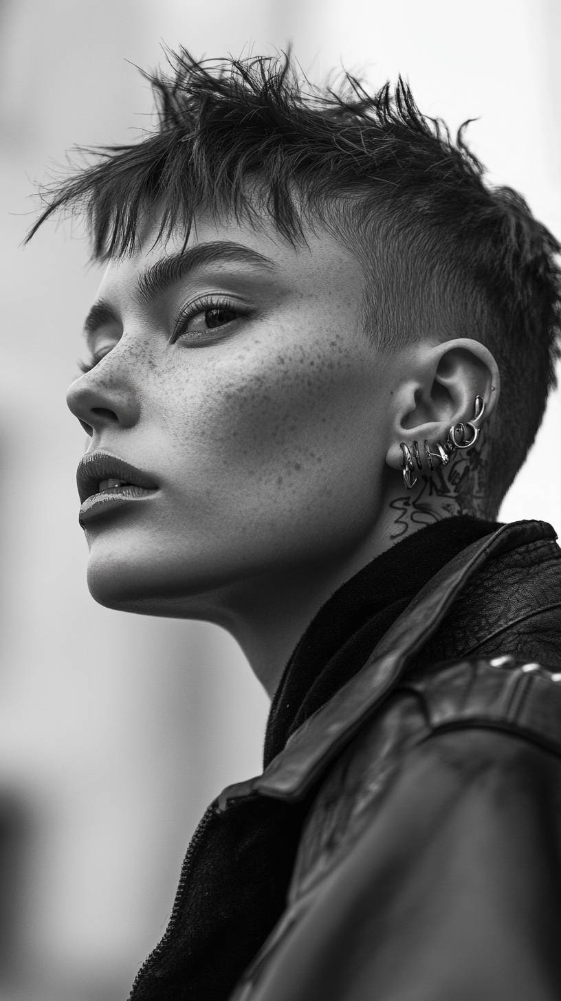 Street shooting of a very self-confident woman with a very androgynous face, stylish short haircut, adorned with facial piercings that highlight her individuality. The image is an extreme close-up, capturing the fine details of her skin texture, the sharpness of her eyes, and the unique contours of her face. The composition is black and white, with high contrast, evoking raw emotion and depth. The scene is photographed in the iconic style of National Geographic's cover of the year, using a Leica camera for stunning clarity and detail. Inspired by the evocative portrait style of Lee Jeffries. --ar 9:16 --style raw --v 6.1