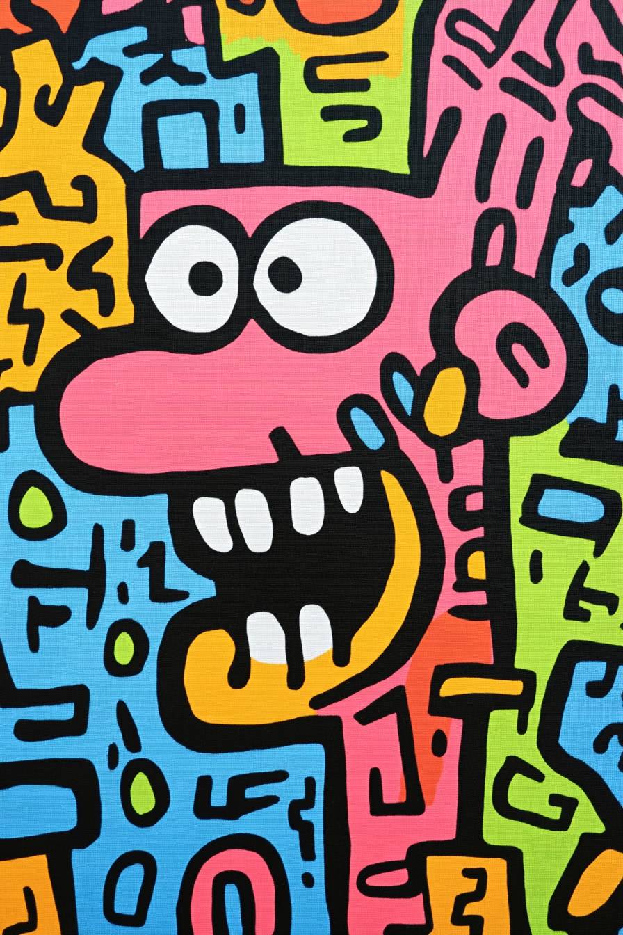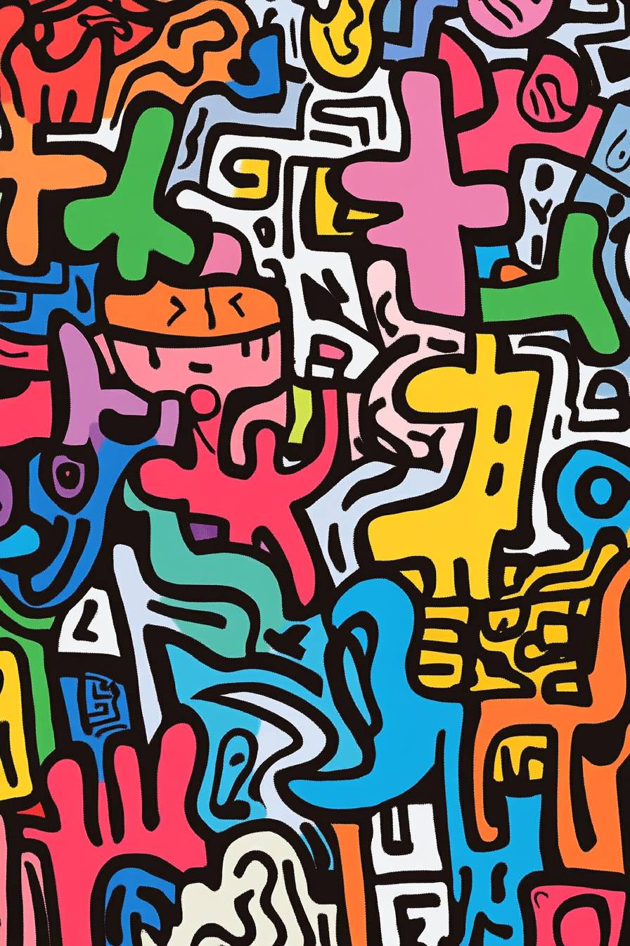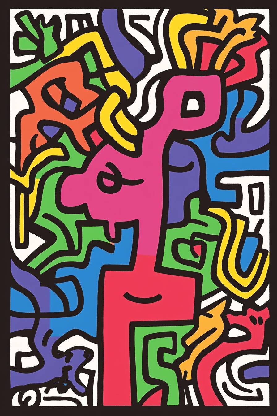 Doodle dans le style de Keith Haring, lignes audacieuses et couleurs solides, minimaliste.