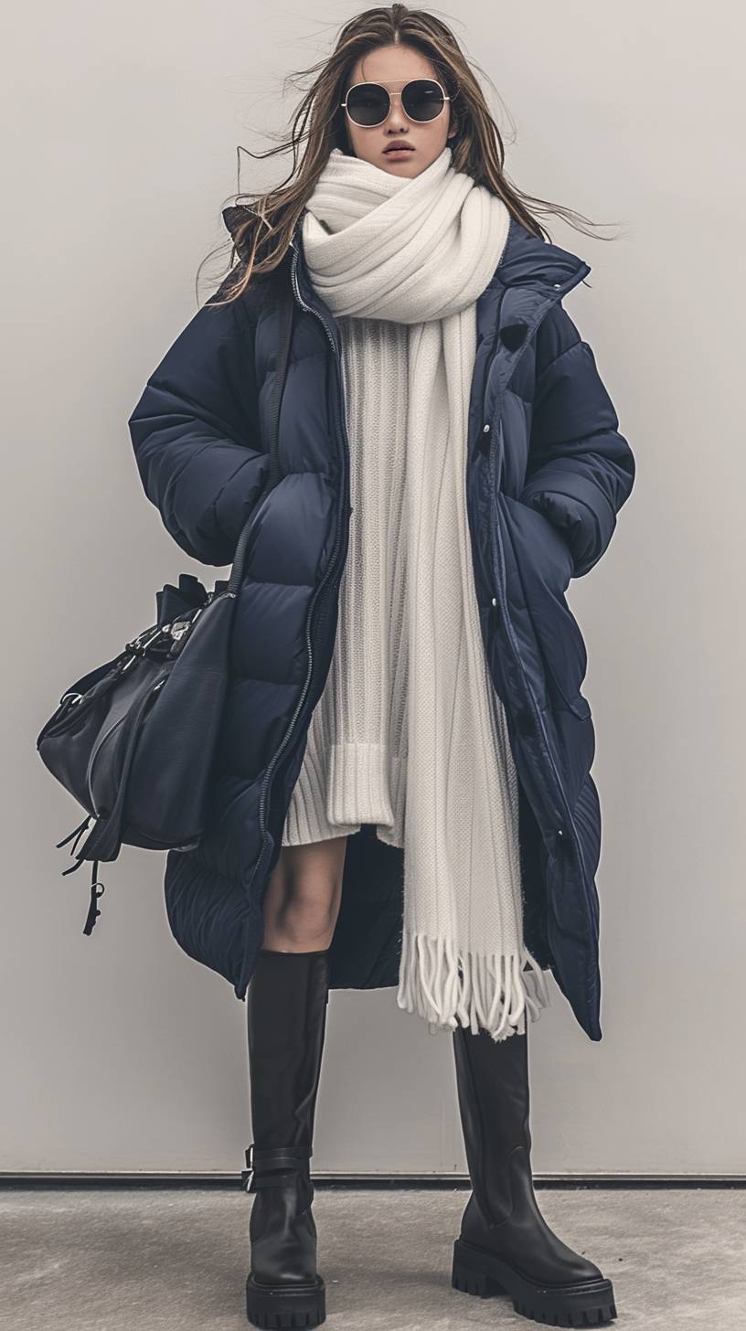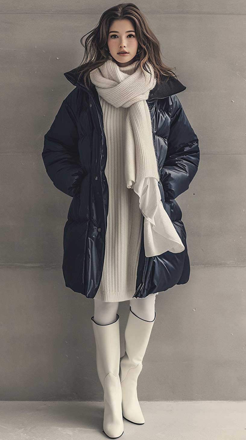 Une femme cool debout, portant une veste en duvet courte de couleur bleu marine profond, une robe en tricot côtelée couleur crème, des bottes à hauteur de genou, une écharpe épaisse et des gants en tricot, les cheveux en queue de cheval décoiffée.