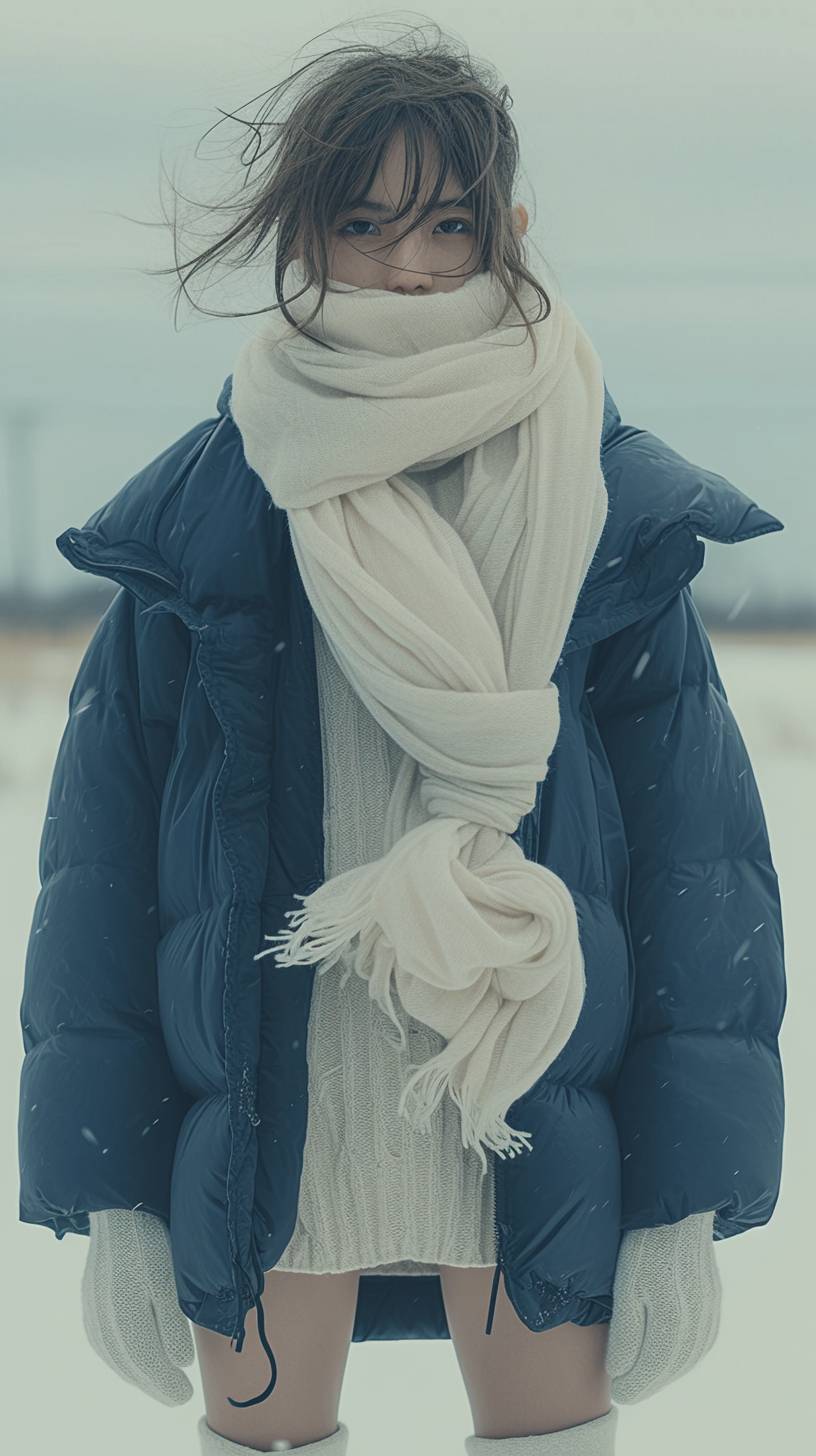 Standing cool woman, wearing cropped puffer jacket in deep navy, ribbed knit dress in cream, knee-high boots, a chunky scarf, and knitted gloves, with her hair in a messy ponytail. --ar 9:16 --style raw --stylize 400 --niji 6