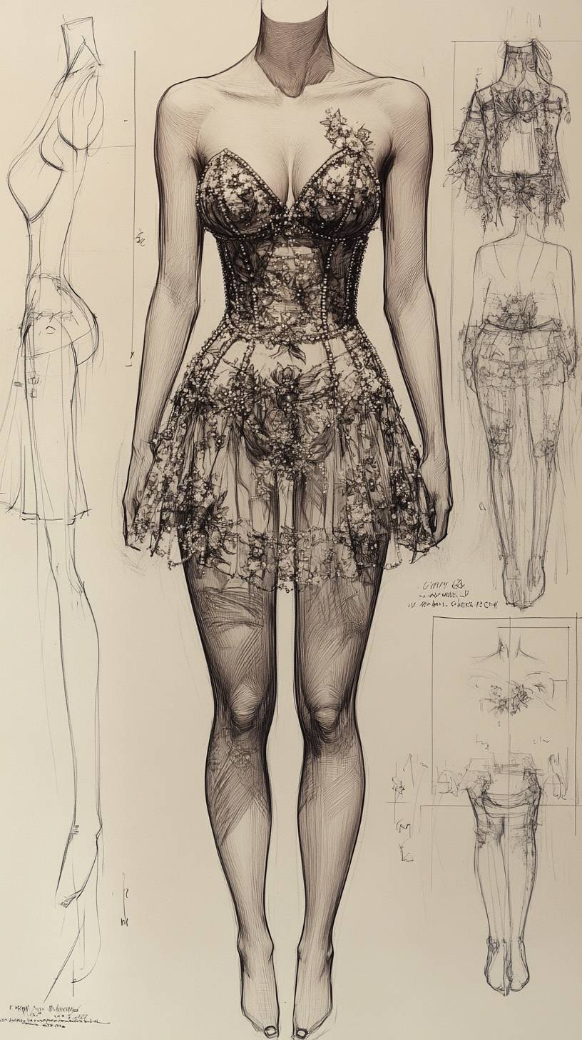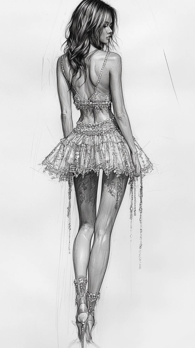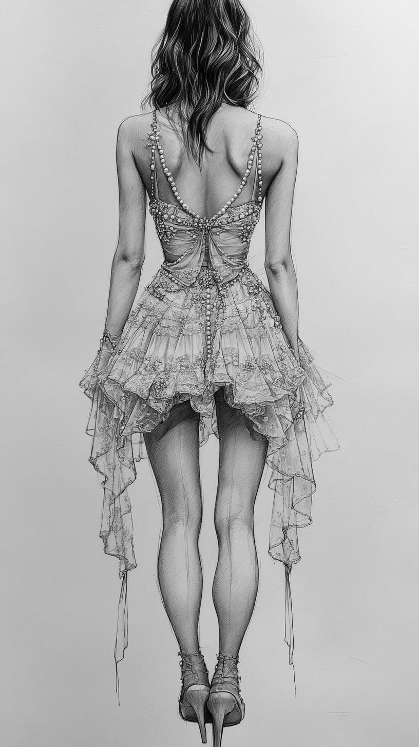 Croquis technique au crayon d'une robe courte en perles de perle, en pleine longueur