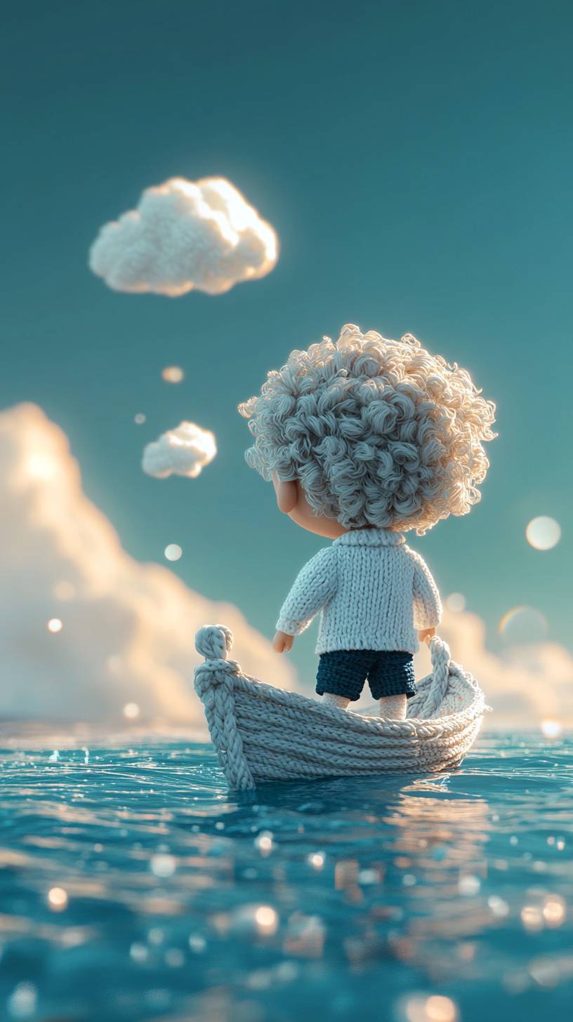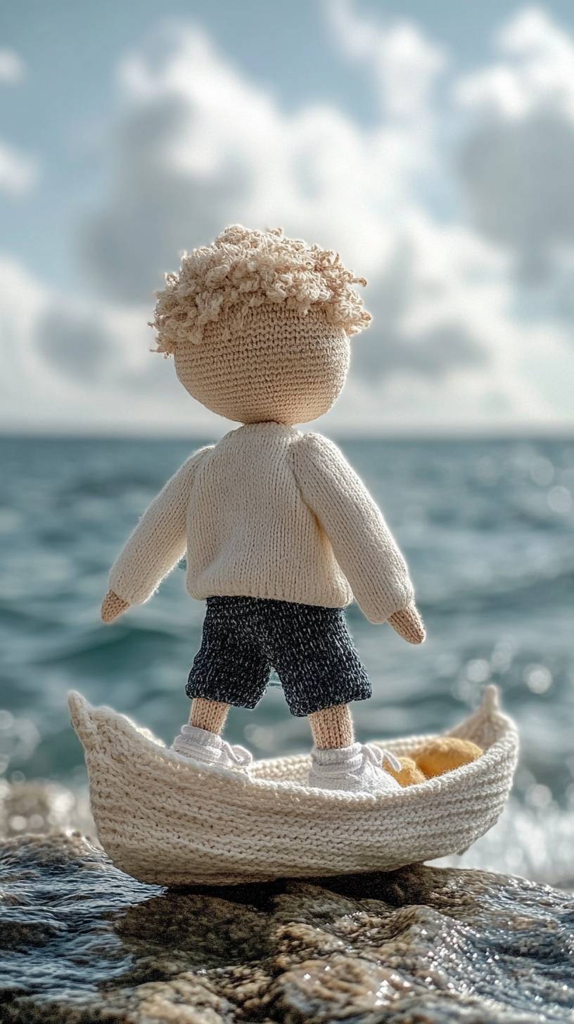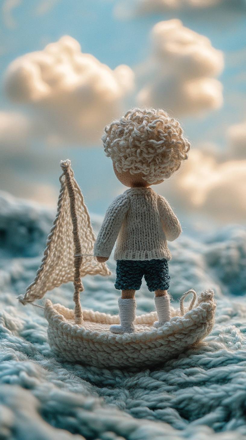 there is a knitted doll of boy, he wears white sweatshirt, dark blue shorts and white shoes, taking a knitted fancy boat on the peaceful ocean, sky is bright and light blue, couple knitted white cloud is there. , he is looking into the distance , the ocean is so peaceful and calm, everything is in light color, feel bright, everything in the picture is knitted with woolen --ar 9:16 --stylize 250 --v 6.1
