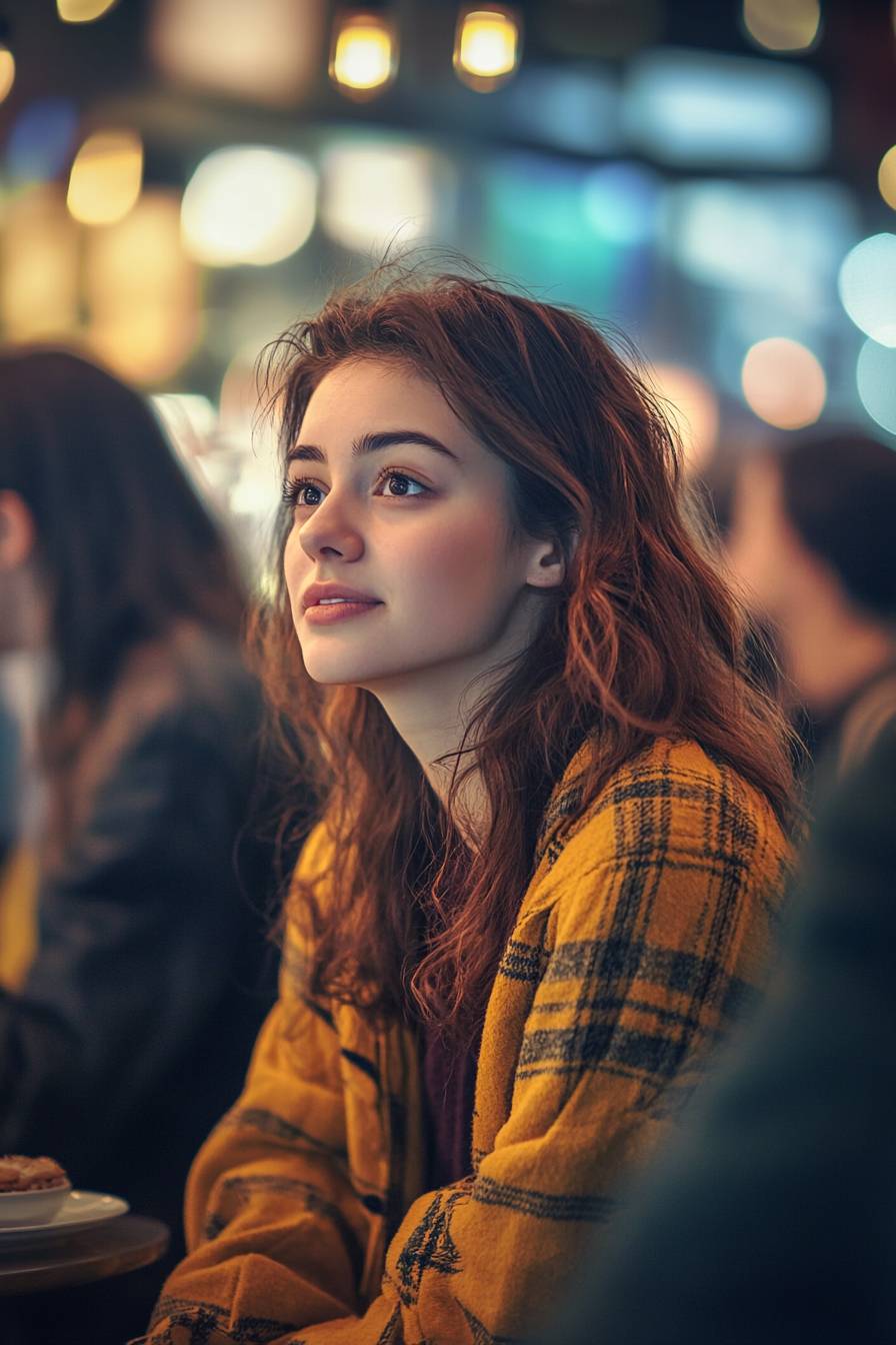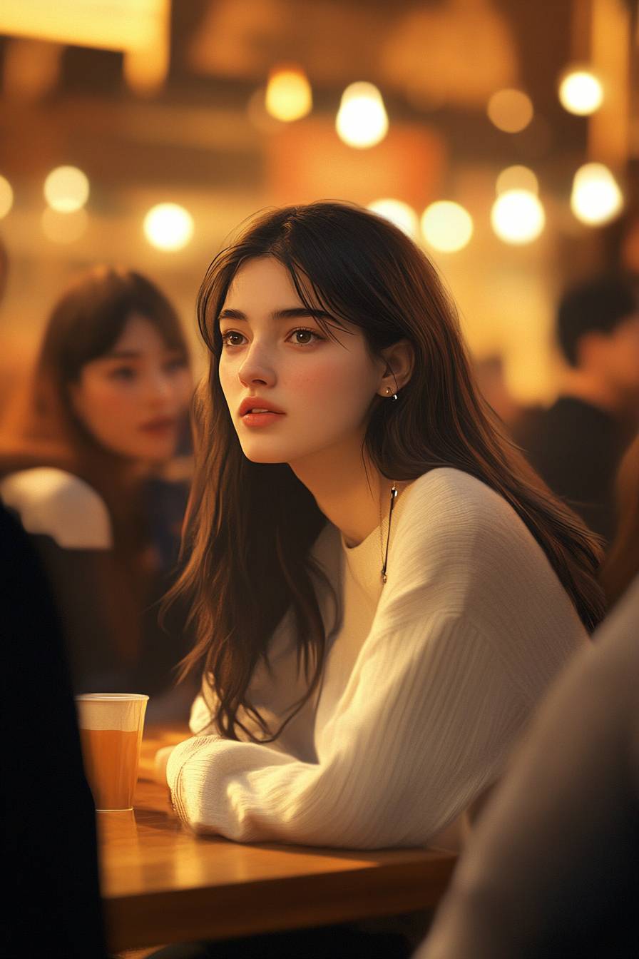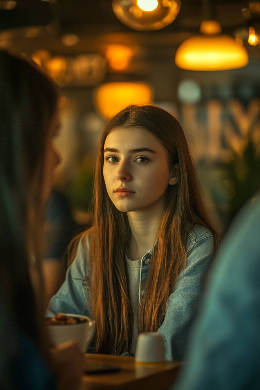 Une adolescente au grand cœur se sent coupable en interagissant avec une foule populaire dans un café trendy, avec de subtiles allusions à ses anciens amis en arrière-plan. Un éclairage chaleureux souligne le conflit intérieur. Style réaliste, ville urbaine moderne, courage et perspicacité, style cinématographique, drôle et amical, atmosphère éveillante et profonde, sentiment d'espoir, flou d'arrière-plan.