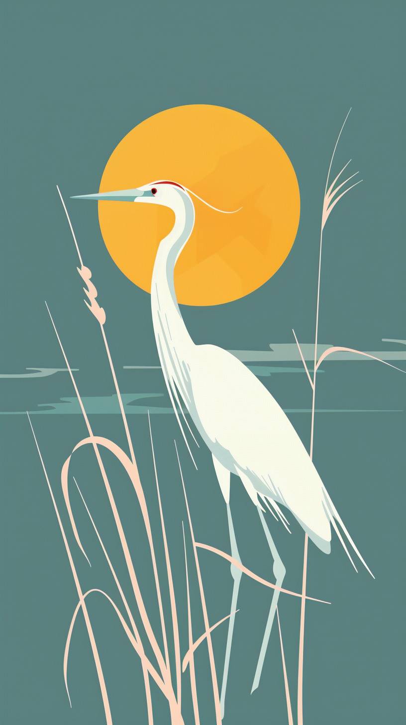 Une illustration plate simple d'un héron devant le soleil, sur un fond vert, sans ombres, utilisant des formes colorées et simples, sur de grandes joncs, dans un style minimaliste, avec une palette de couleurs bleue et blanche.