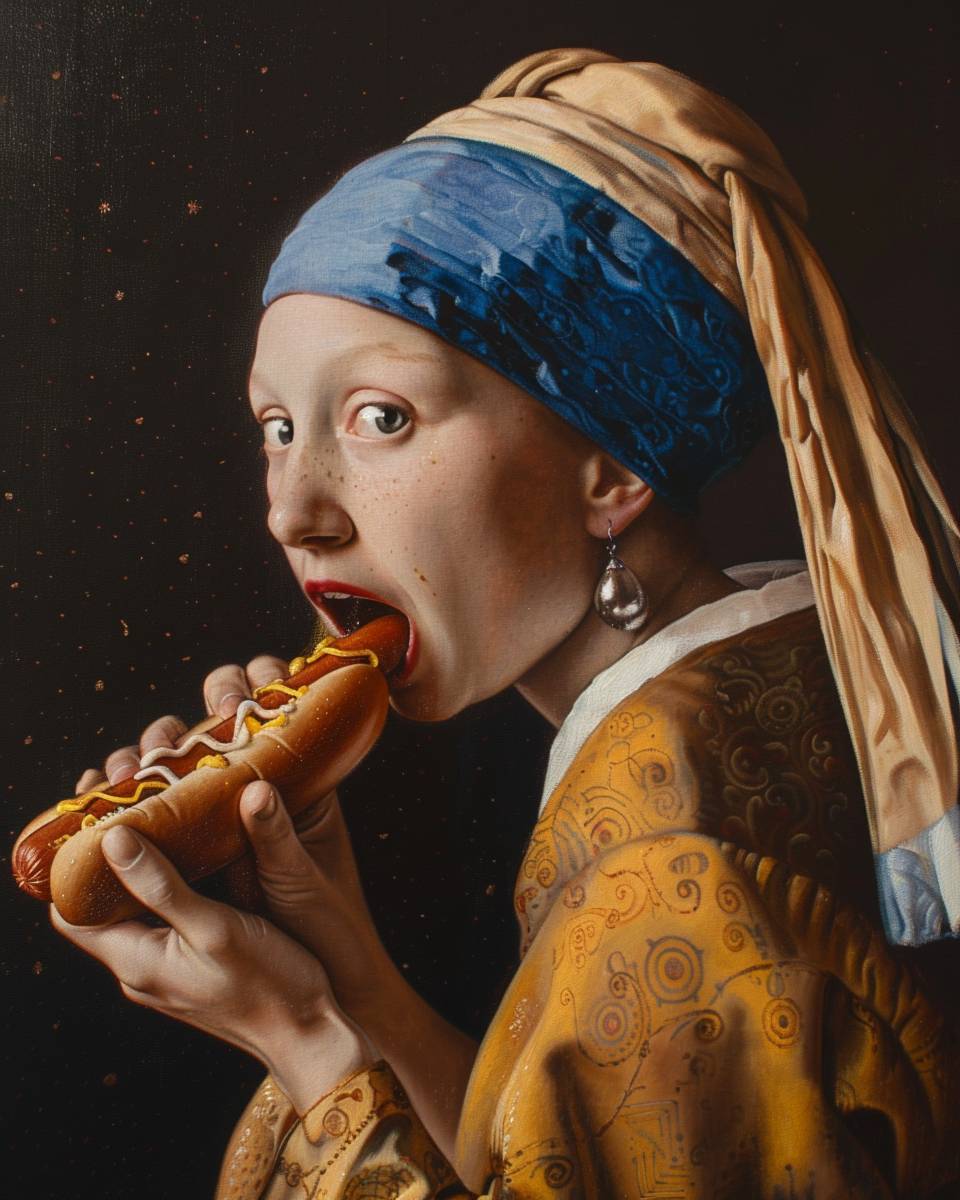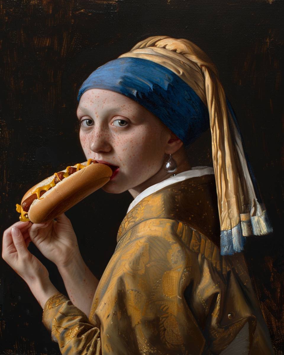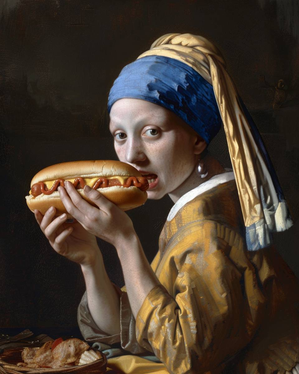 Recréer la peinture iconique de Vermeer 'La jeune fille à la perle', avec le sujet prenant une énorme bouchée d'un hot-dog qu'elle tient à deux mains, en conservant le même arrière-plan intérieur que dans l'œuvre originale.