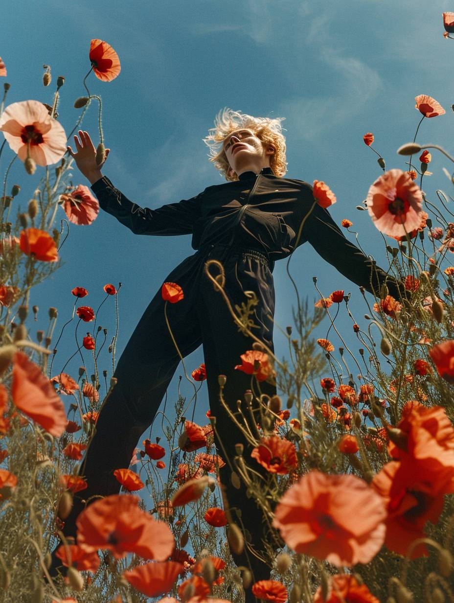 Un homme blond en survêtement noir flotte dans les airs entouré de fleurs de coquelicot, dans le style de Tim Walker et Rineke Dijkstra.