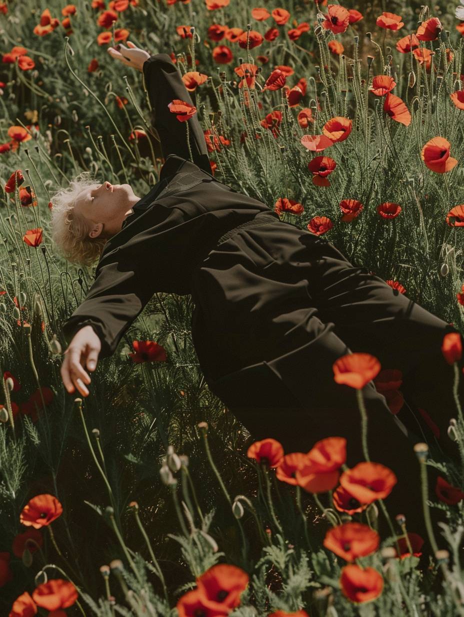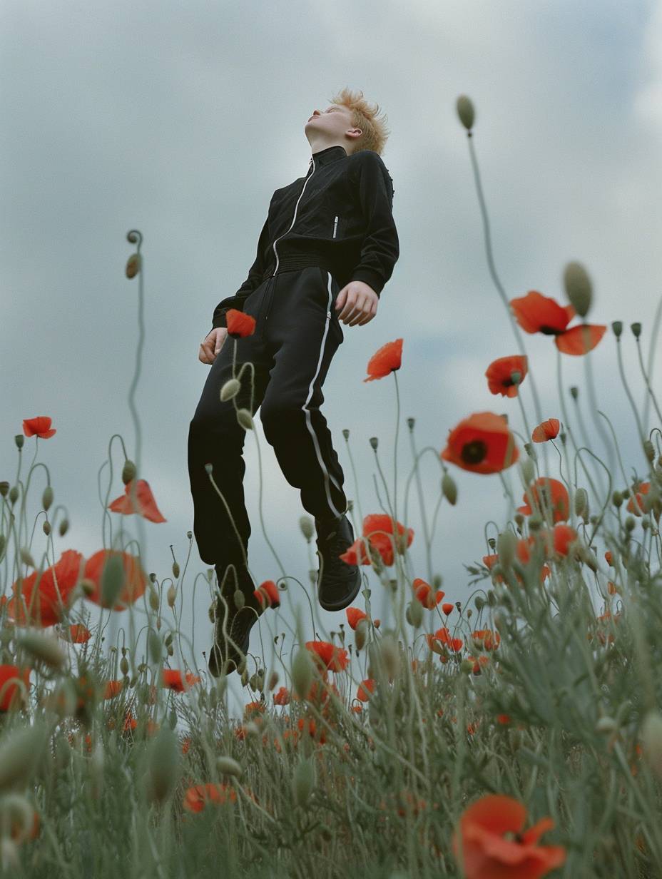 photo of blonde man wearing black tracksuit, floating in the air surrounded by poppy flowers, in the style of Tim Walker and Rineke Dijkstra --ar 3:4 --v 6.0