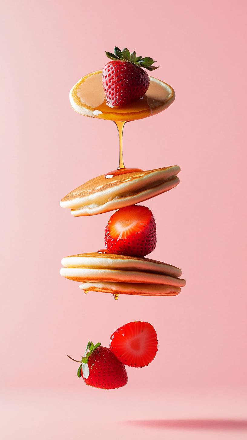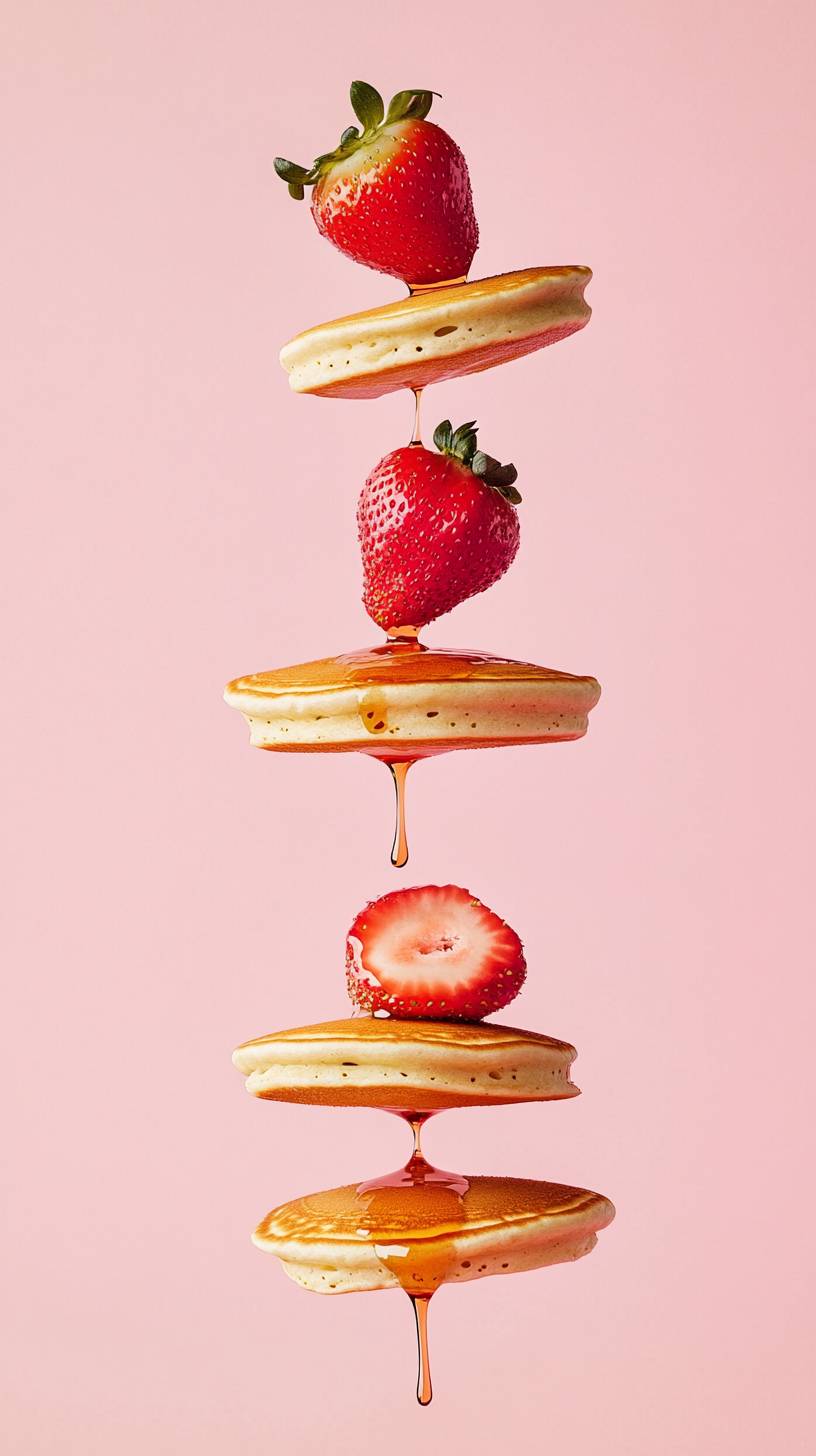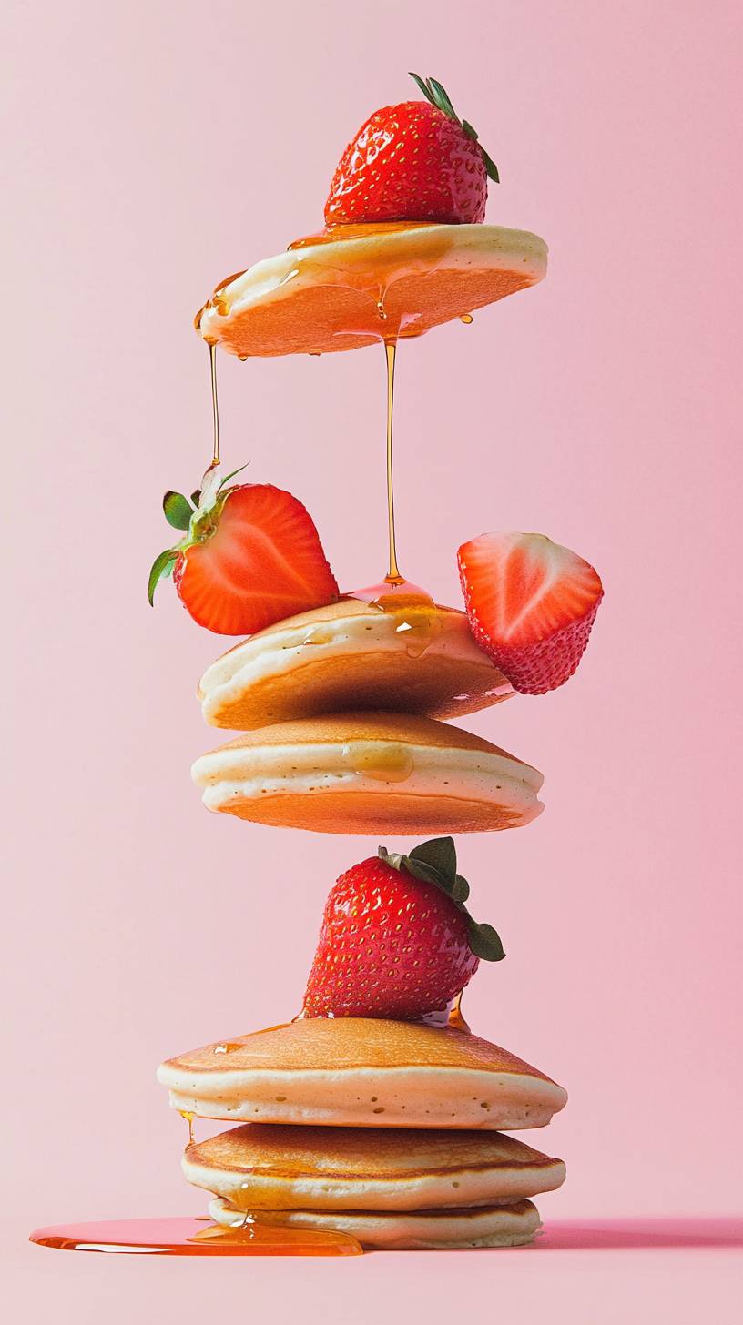food photography, studio lighting, different angle of pancake, maple syrub and strawberry falling on top each other in different angles, remind me of japanese rock balance technique, isolated pastel background --ar 9:16 --stylize 50 --v 6.1