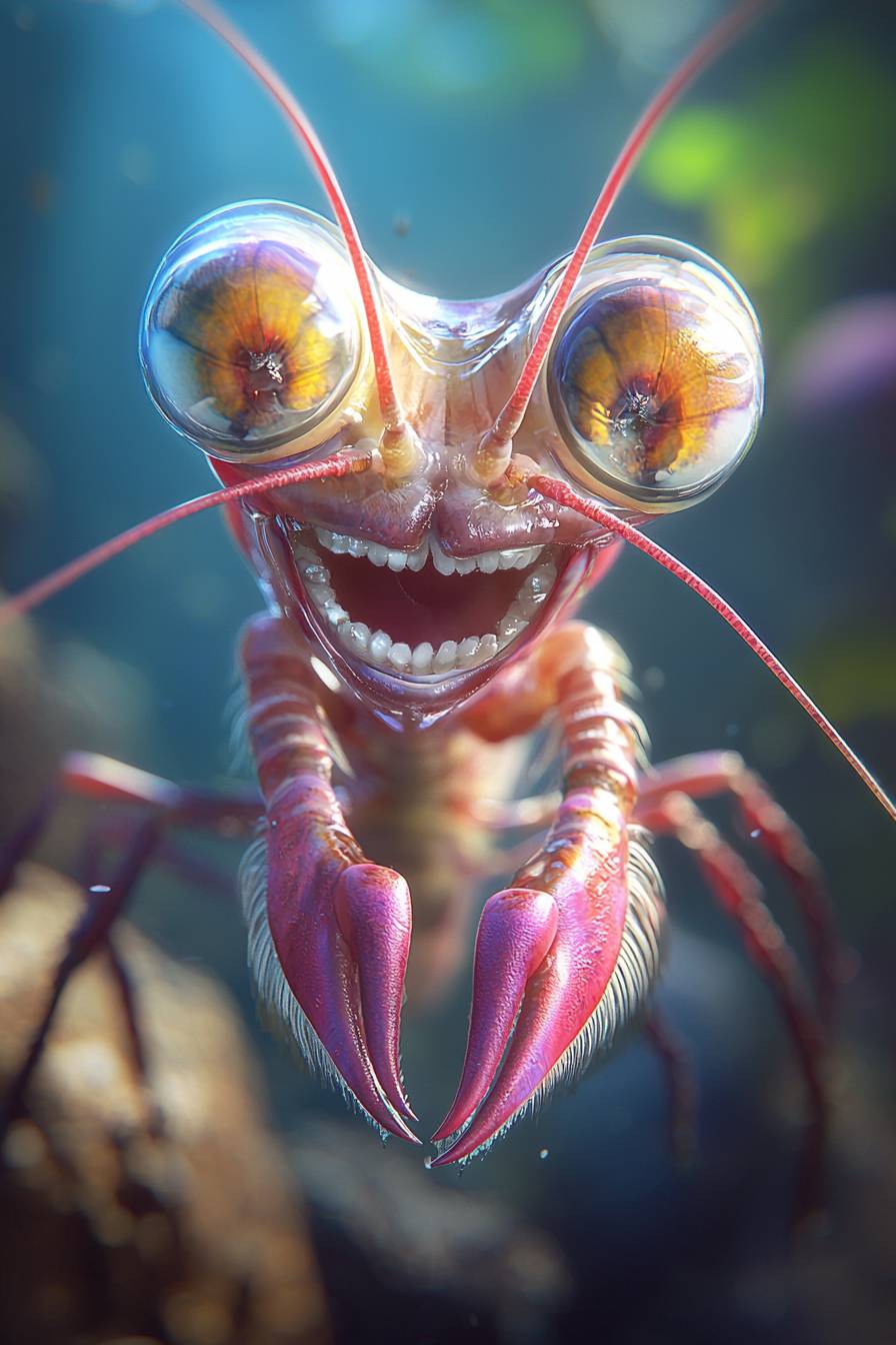 Une crevette mante exagérée et cartoonesque rendue avec des graphismes de GameCube et des détails hyperréalistes.