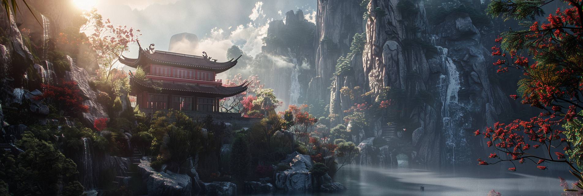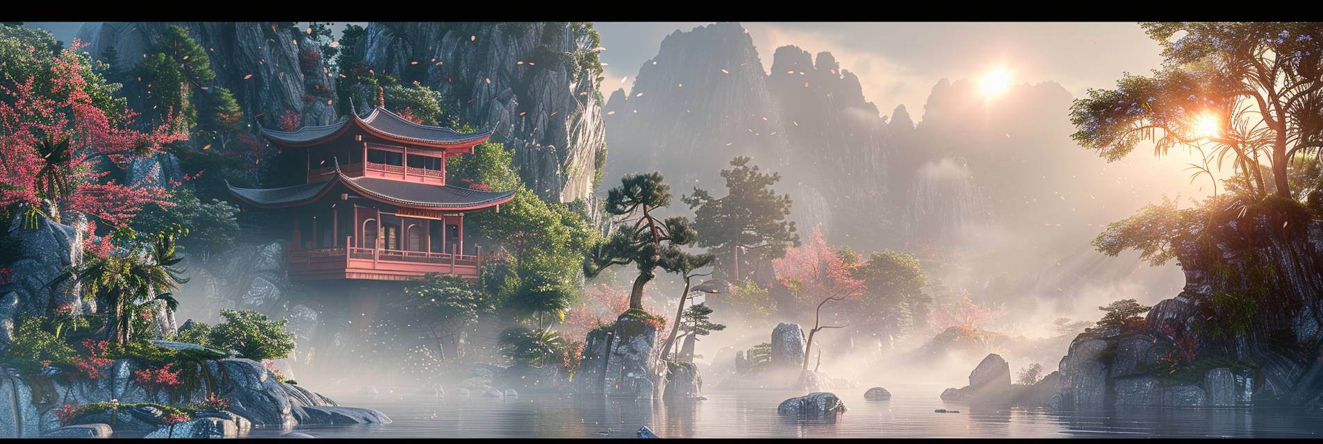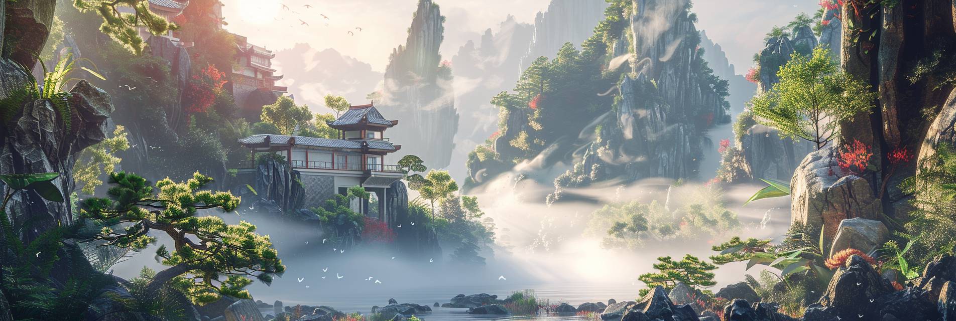 beautiful Oriental fantasy, full of sunlight, fine details, hyper quality, architectural visualisation, mist-shrouded, Chinese architecture, Mountains and rocks, Sunshine, Botany, isometric, c4d, 4k, 8k --ar 3:1 --v 6.0