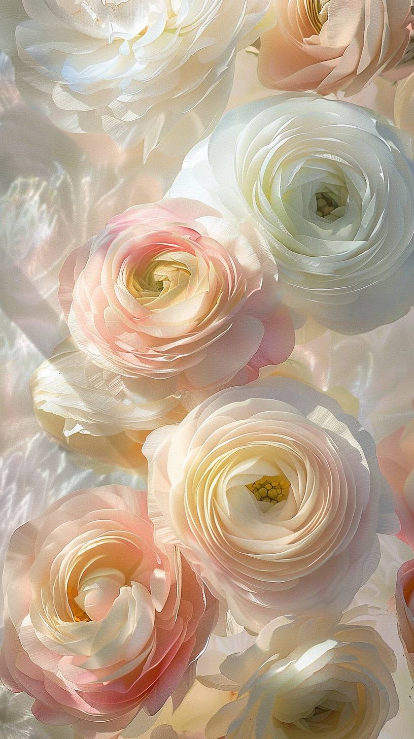 Ranunculus, bright and shiny background, transparency, gold, white, light pink, sparkling cherry petals dancing ,artwork by Jeffrey Catherine Jones --ar 9:16 --style raw --v 6.0