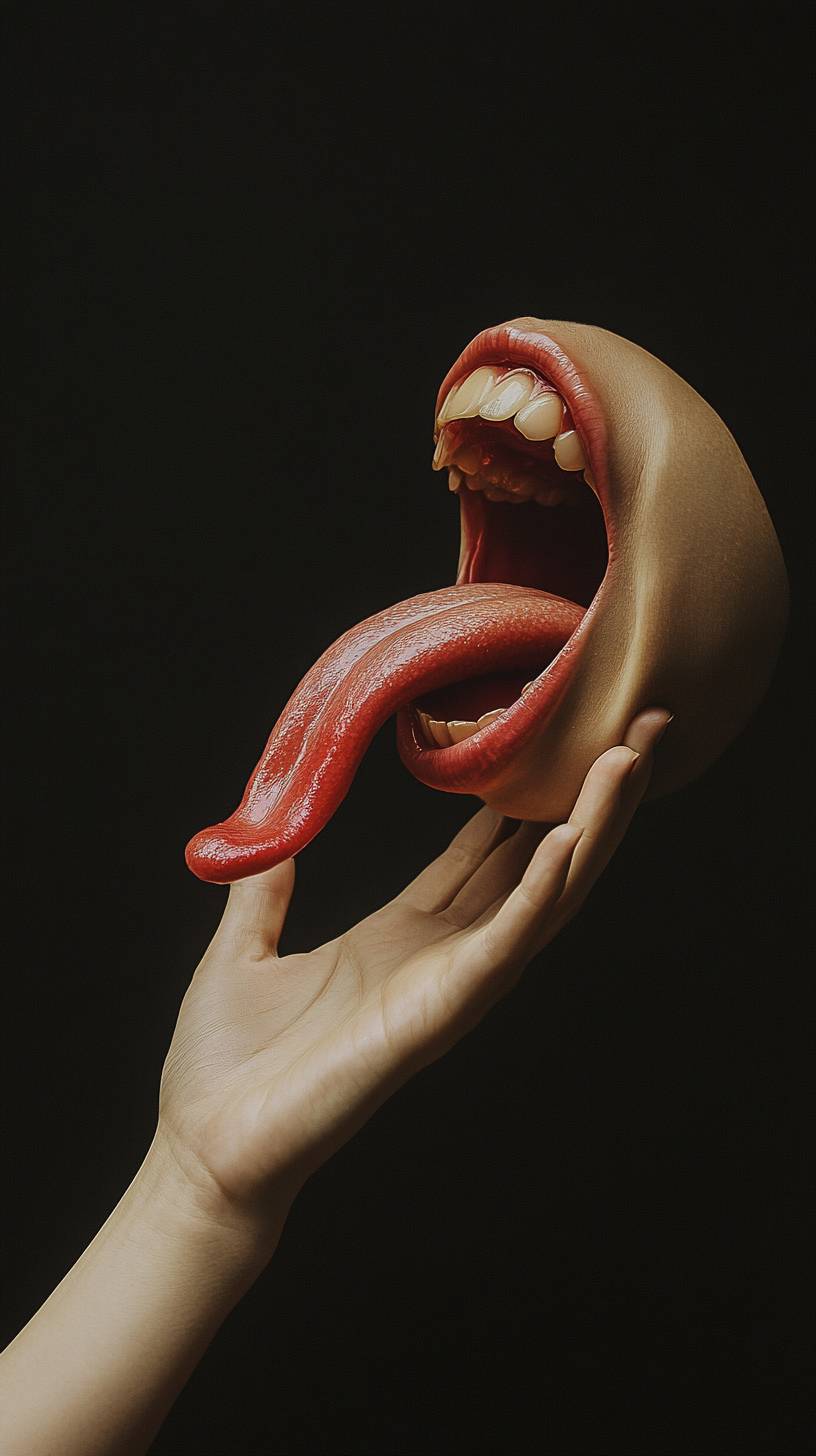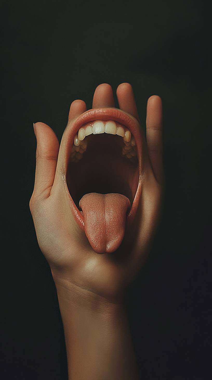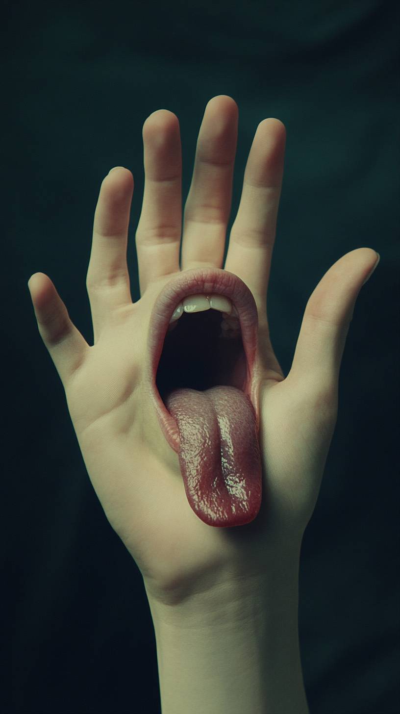 Une bouche avec une longue langue sortant du milieu d'une paume humaine