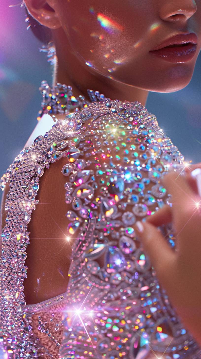 Une publicité en gros plan d'un corps de femme couvert de diamants, montrant des détails intenses et un style hyperréaliste.