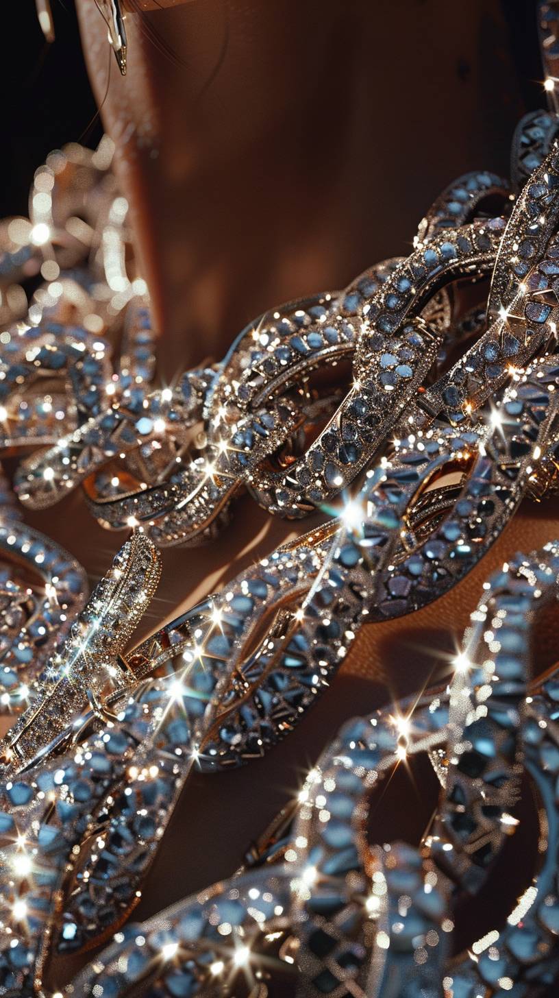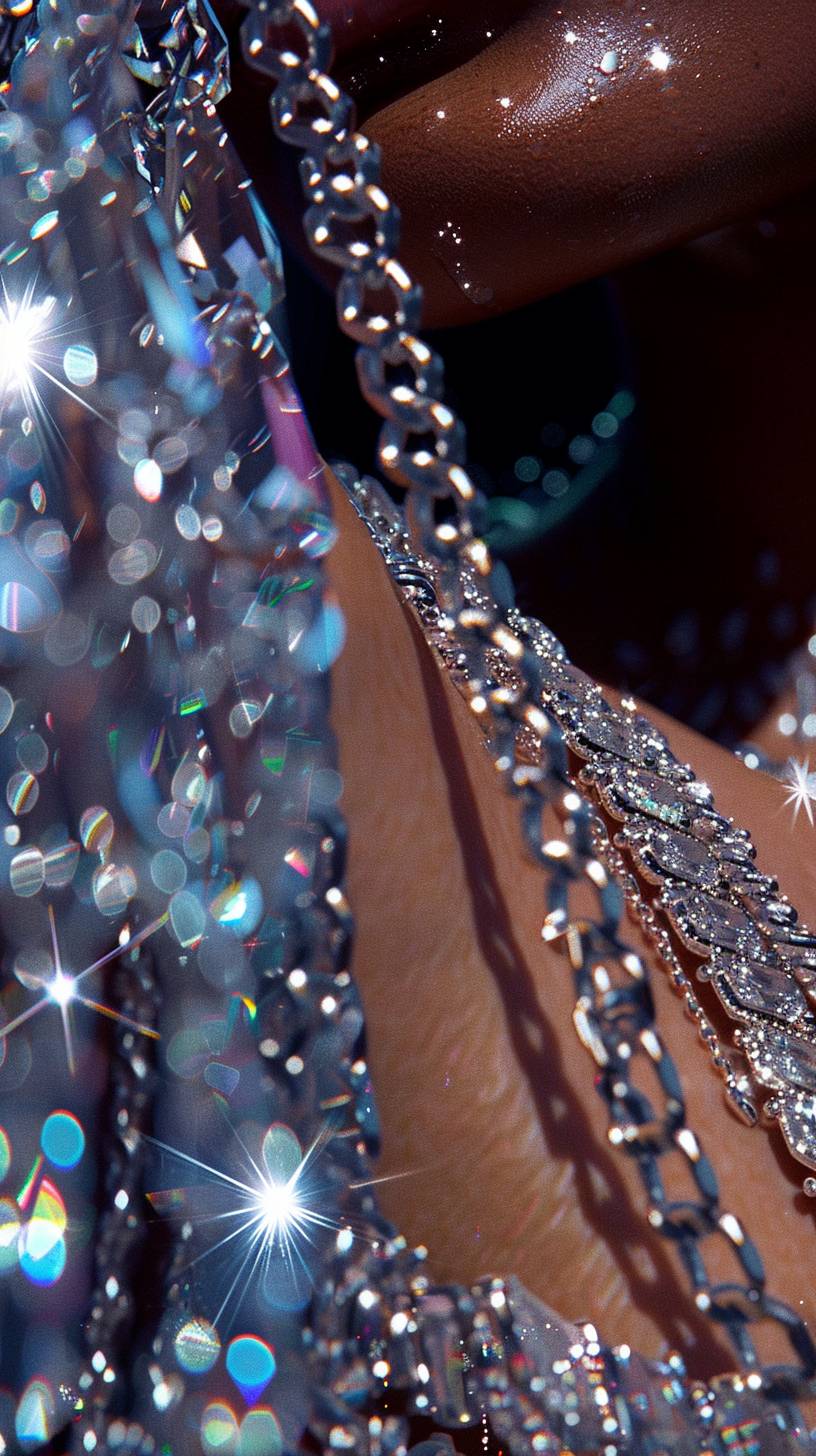 A close up of the shoulder and arm with lots of diamond chains around it, in the style of David LaChapelle, a magazine advertisement of a woman's body covered in diamonds, shiny, closeup intensity, in the style of David LaChapelle, in the shape of an hourglass, closeup, hyper realistic, detailed, realism, masterpiece, high resolution, full HD. --ar 9:16 --style raw --v 6.0