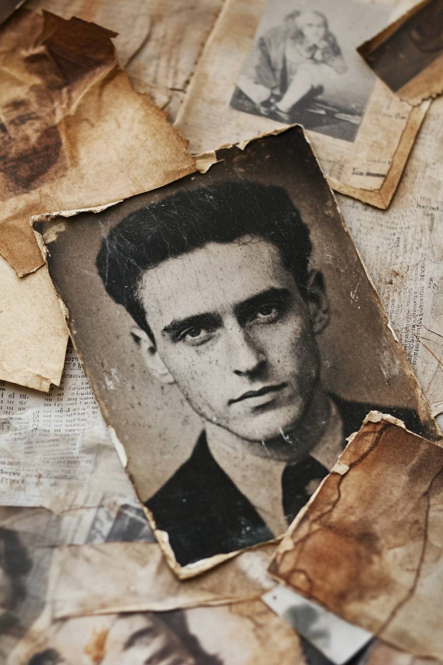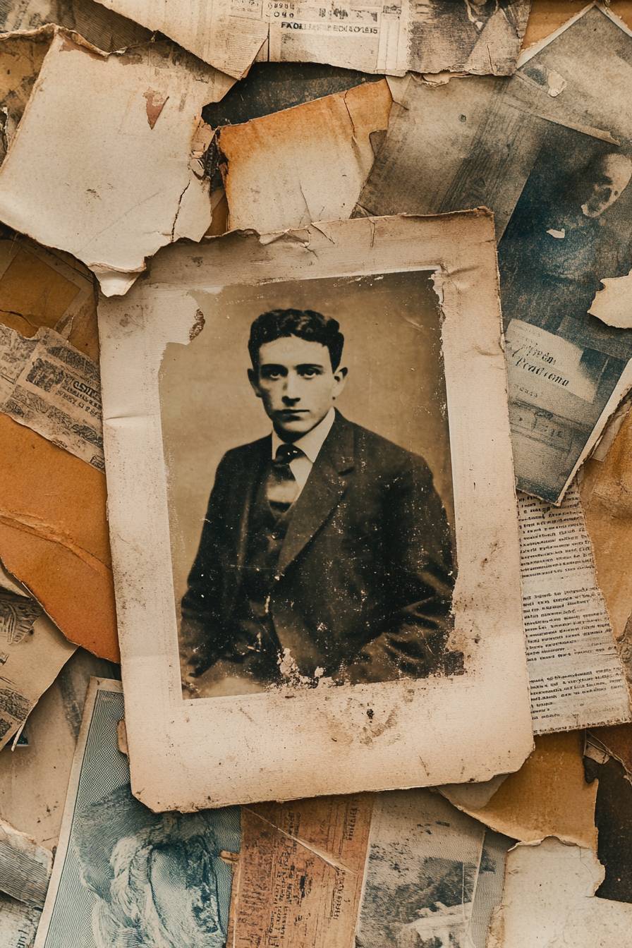 Esthétique grunge avec texture de film fané, surfaces craquelées, tons monochromatiques, couches de vieilles photographies, coupures de vieux journaux et une sensation nostalgique.