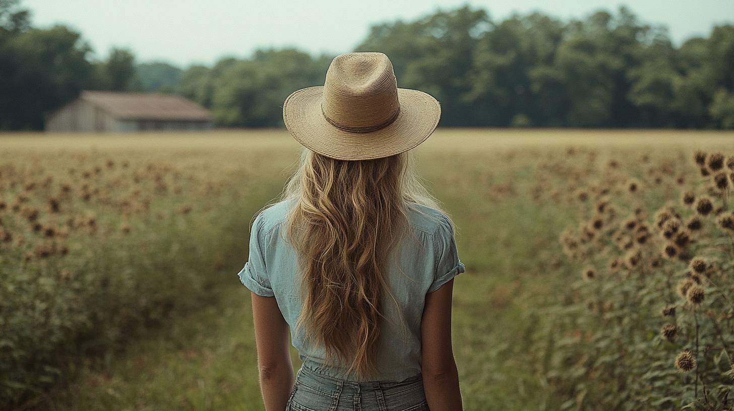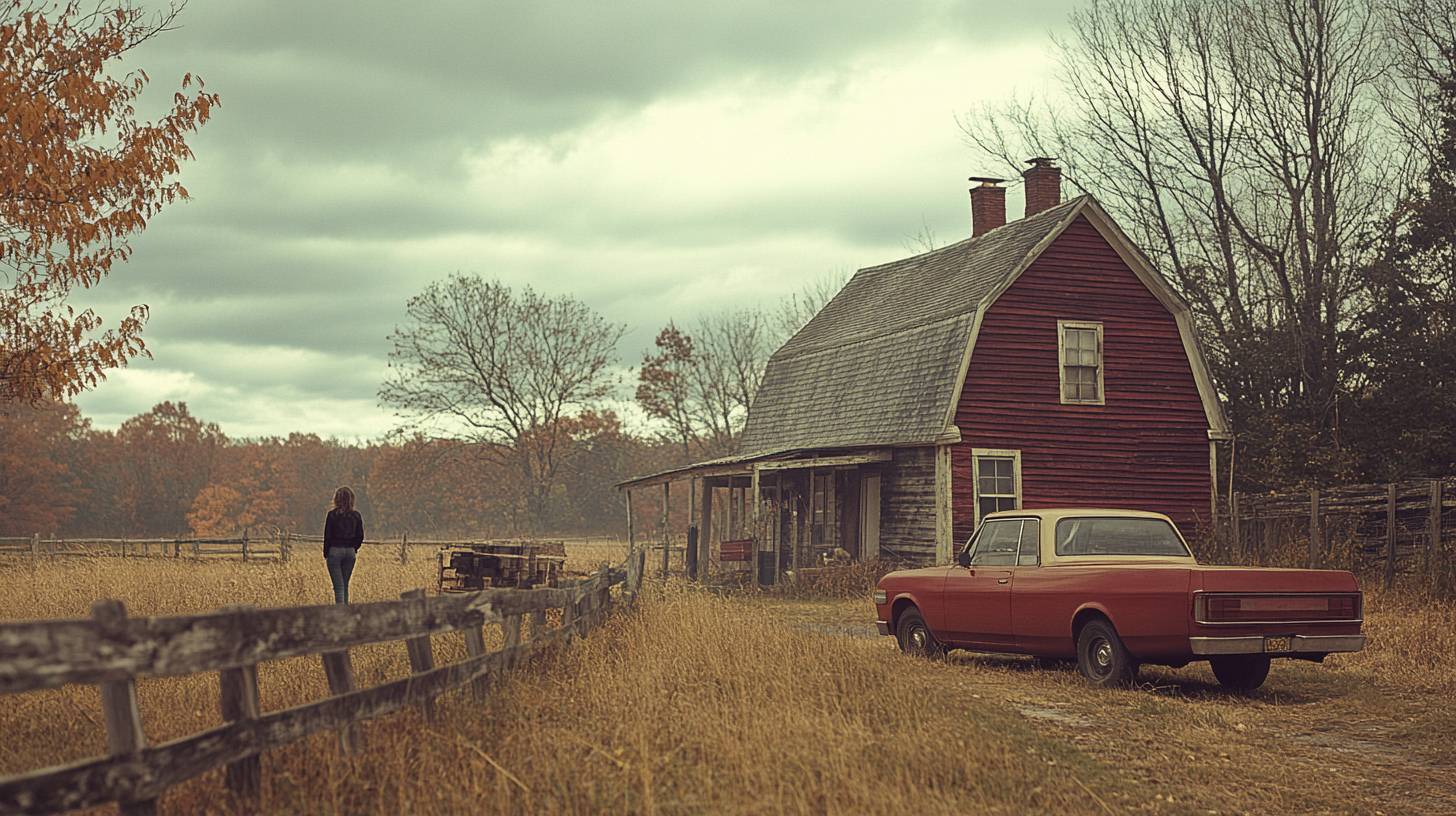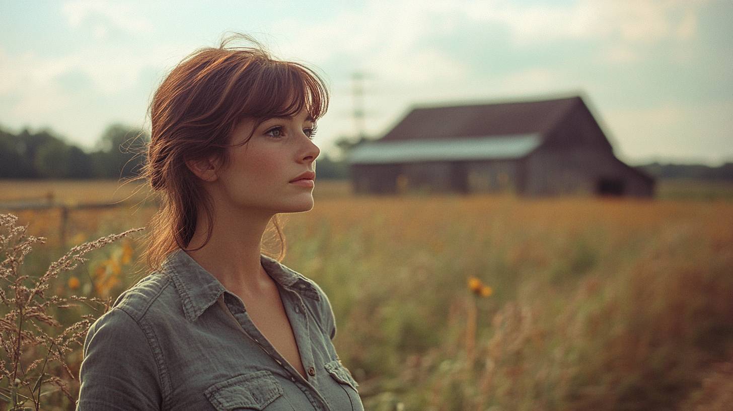 Prise cinématographique d'une femme à la ferme en 1974, esthétique rétro.