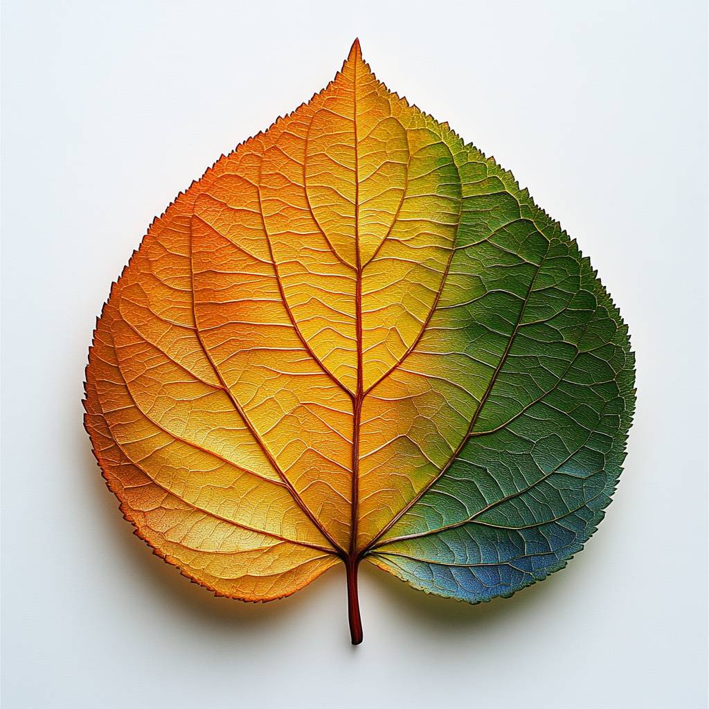 Une feuille de couleur [COLOR] en forme de [SUBJECT]. La feuille doit être détaillée, avec des veines et des textures ressemblant à une vraie feuille. La forme doit imiter la silhouette d'un [SUBJECT], mais être entièrement composée de textures et de couleurs de feuilles. L'arrière-plan doit être simple pour mettre en valeur la forme unique de la feuille.