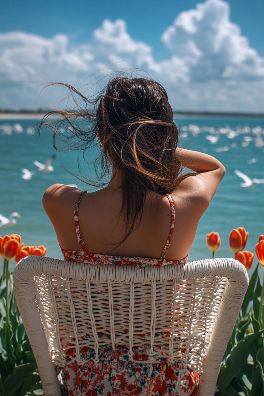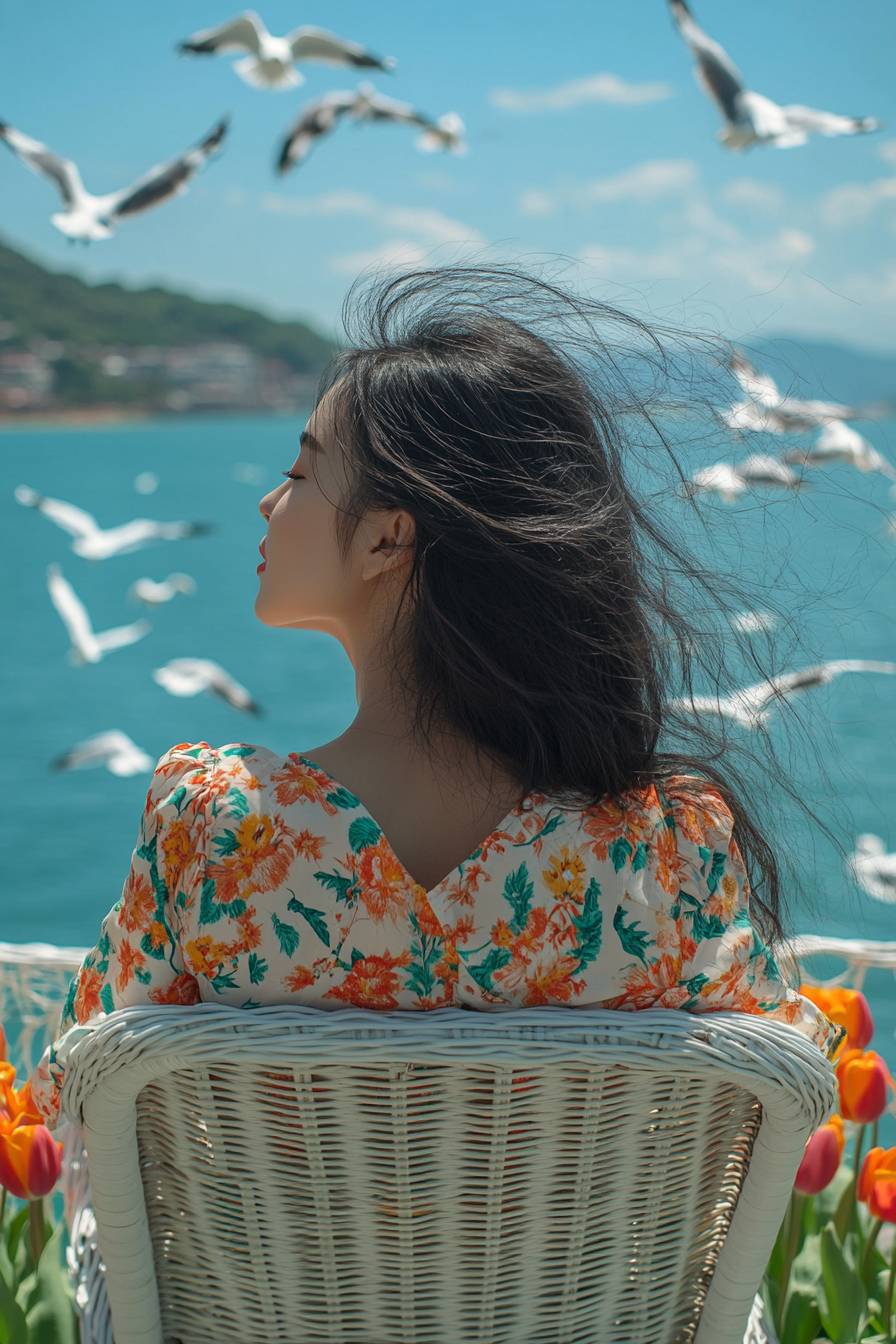 Photography, wallpaper, Leica, vacation, the back view of a young black-haired girl in floral clothes lying on a White rattan lounge chair, her hair fluttering in the wind,Stretching hands to the sky, stretching, in front of her is an endless blue lake, there are a few red-billed gulls in the sky, tulips by the lake, a large blue sky, White rattan lounge chair,real scene, natural light and shadow, happy, leisurely, sunlight, 4K, large scene, looking up, long-range view --ar 2:3 --style raw --stylize 400 --v 6.1