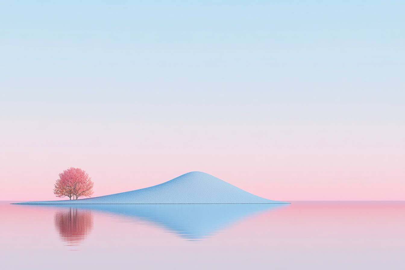 Un paysage lacustre tranquille avec des reflets doux et flous dans l'eau. Un ciel pastel atténué se fondant harmonieusement avec la surface, de douces ondulations déformant le reflet. Une profondeur atmosphérique subtile, minimale et poétique, évoquant une ambiance rêveuse et méditative. Un équilibre parfait entre calme et mouvement.