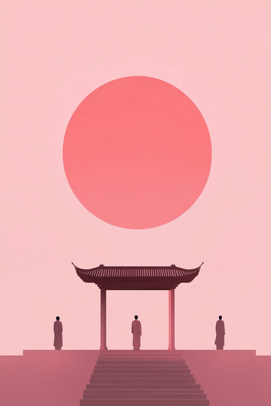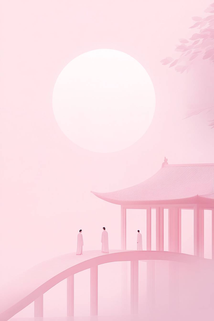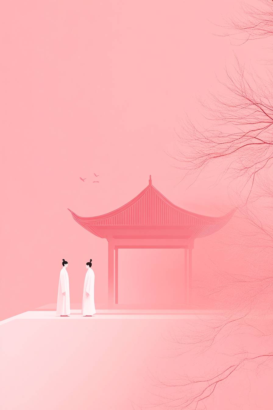Minimalist illustration of people in chinese ancient standing on the pavilion, pink gradient color scheme, in the style of Atey Ghailan. --ar 2:3 --style raw --profile oiwf4m5 zww2nvy --stylize 150 --v 6.1