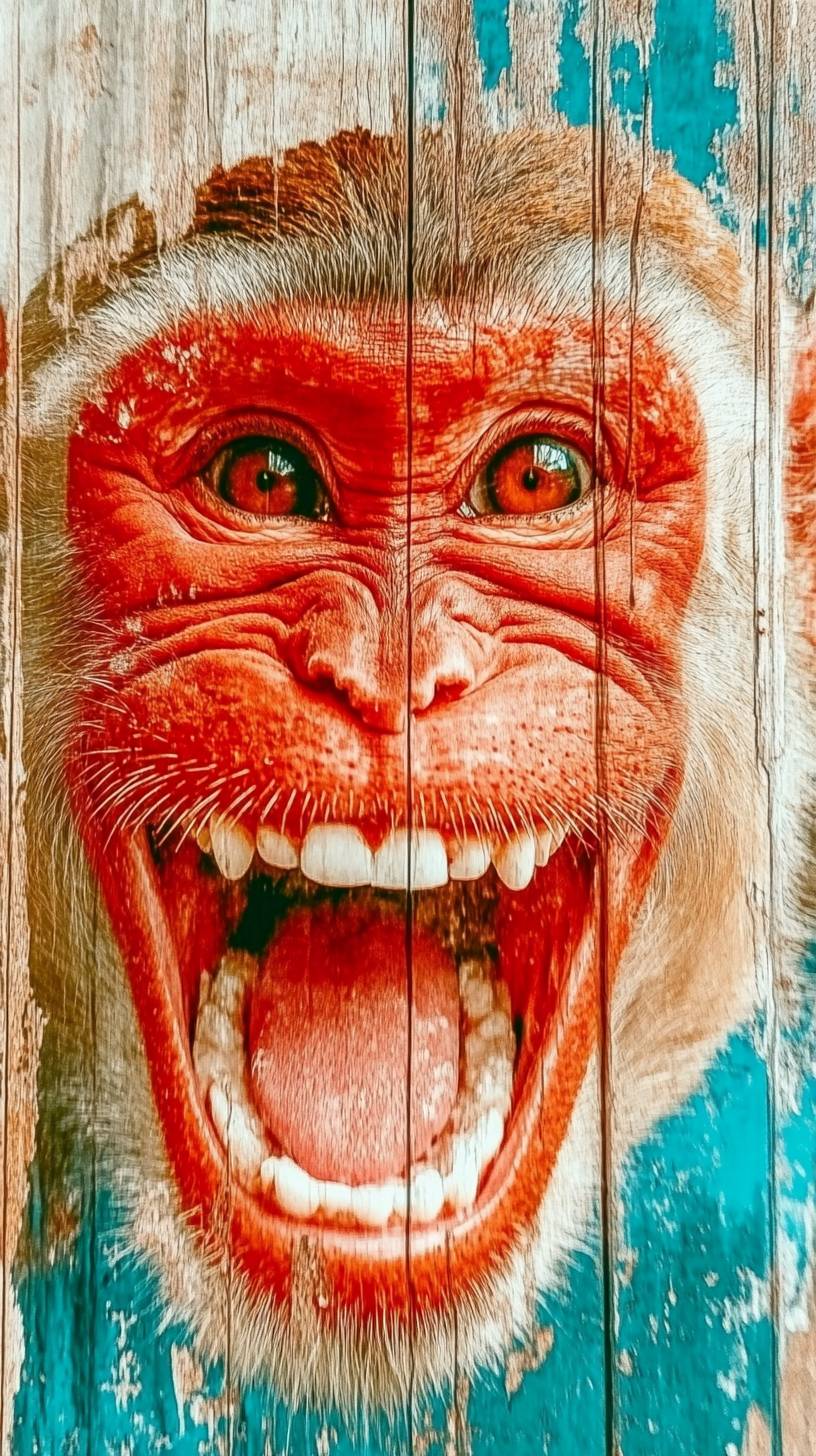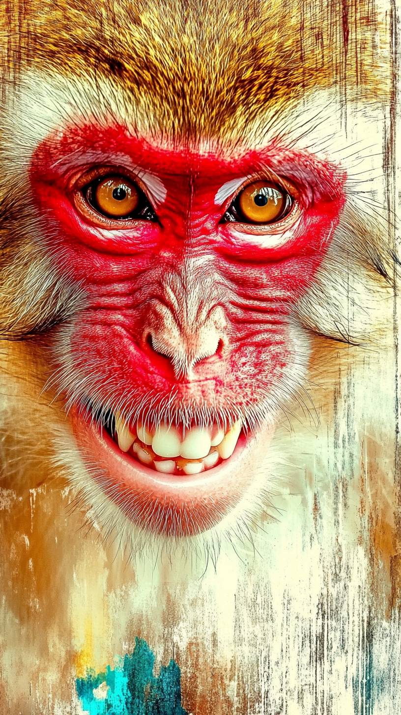 Colorful Japanese retro poster, a Japanese Macaque monkey with a red face and big smile, print, extraordinary expression, proud, strong sense of contrast, mix of avant-garde art --chaos 35 --ar 9:16 --style raw --profile sbm8fmc --stylize 650 --weird 100 --v 6.1