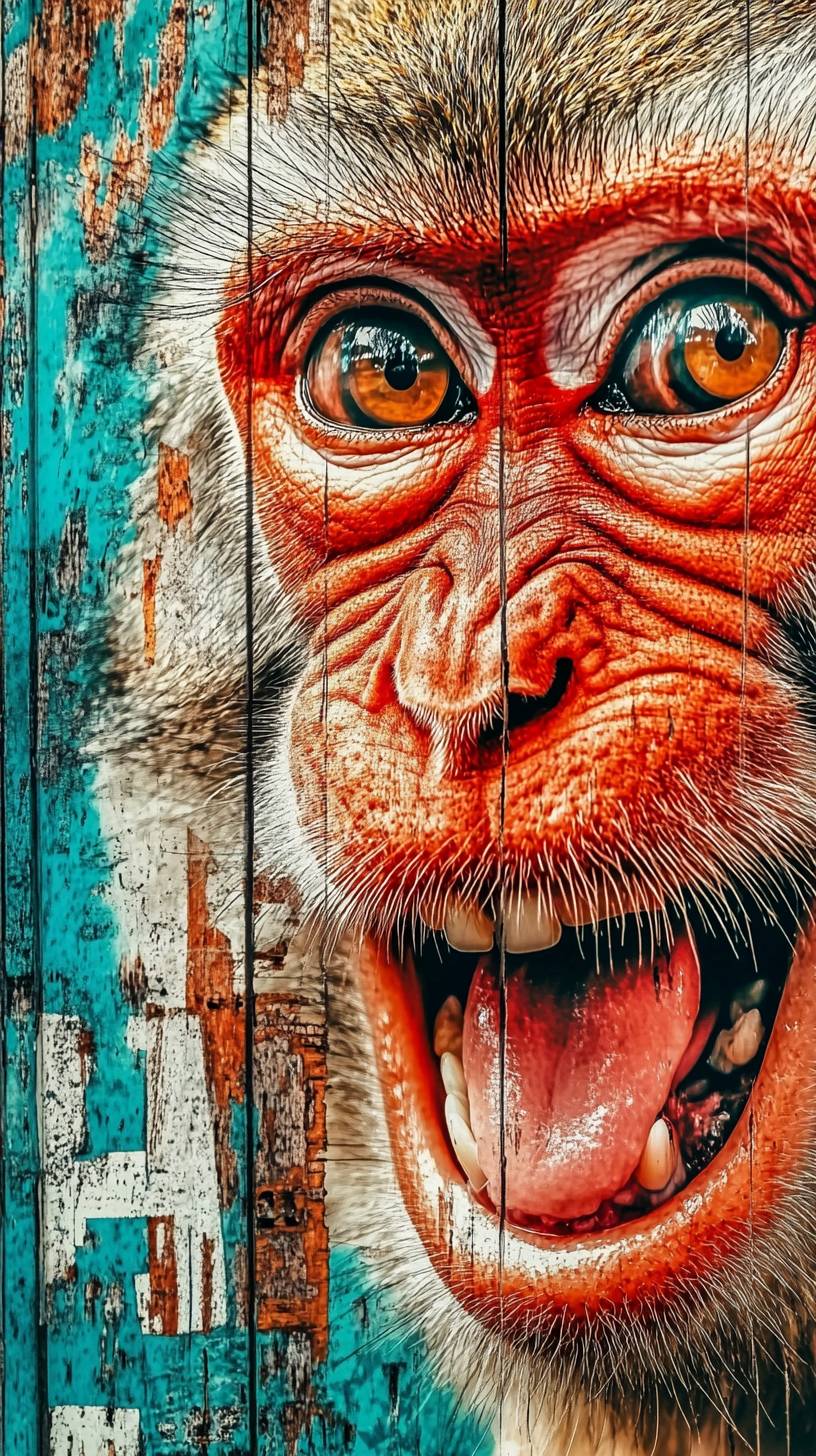Un macaque japonais à visage rouge et grand sourire présente une expression extraordinaire et un fort contraste dans une affiche rétro.