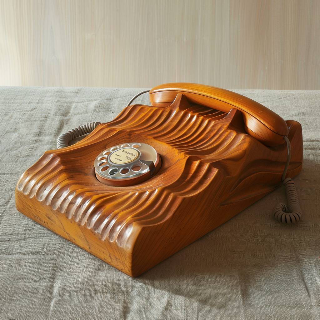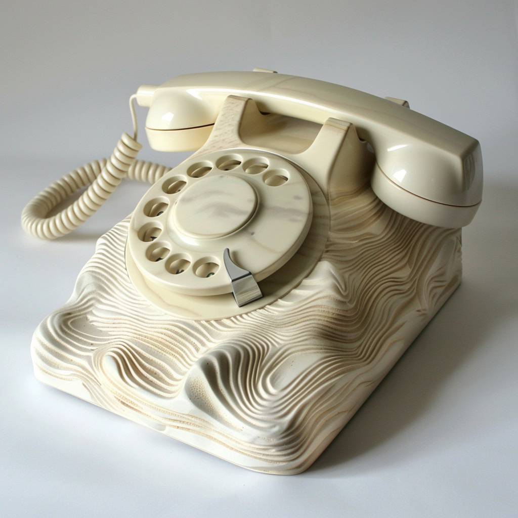 Téléphone fixe rotatif des années 1970 fabriqué à partir d'un matériau à texture ondulée.