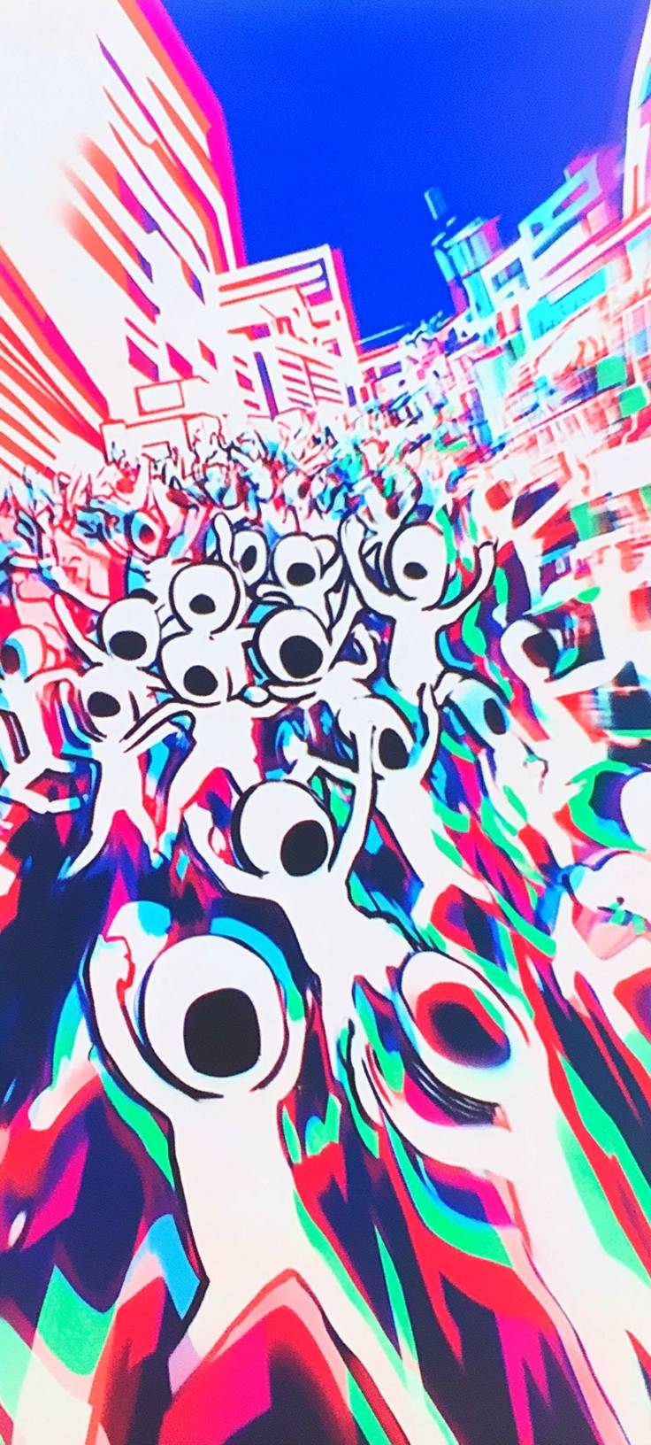 A crowd of faceless, dancing figures, intertwined with pulsing, geometric lines and oversized, random positions and energy levels, set against a vibrant, chaotic cityscape, bold primary colors with thicks black outlines, a fusion of street art dynamism and abstract surrealism, the background pulses with rhythmic, hypnotic patterns, random chromatic aberrations --no extra colors --ar 9:20 --style raw --profile aq6x6wh --v 6.1