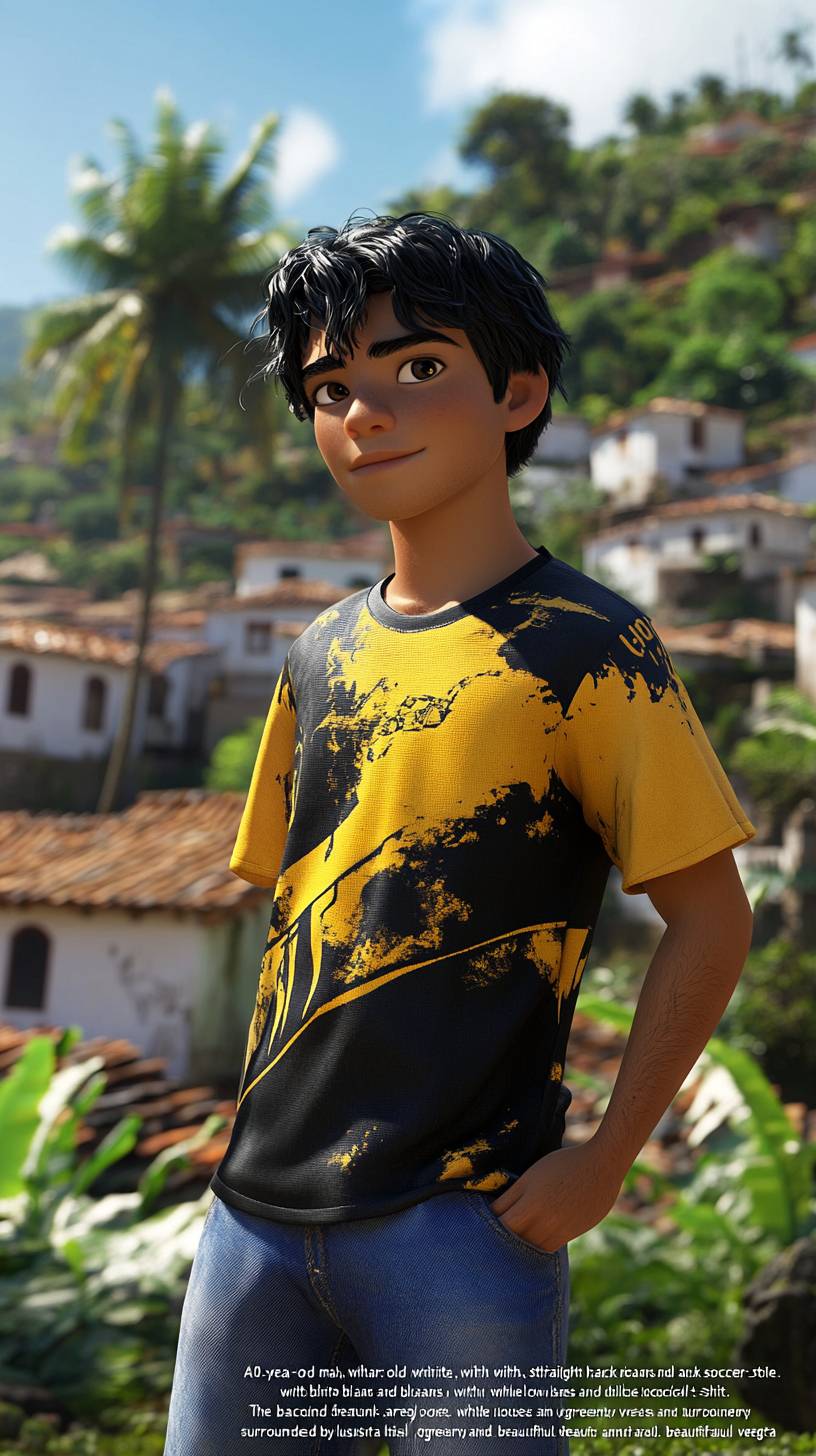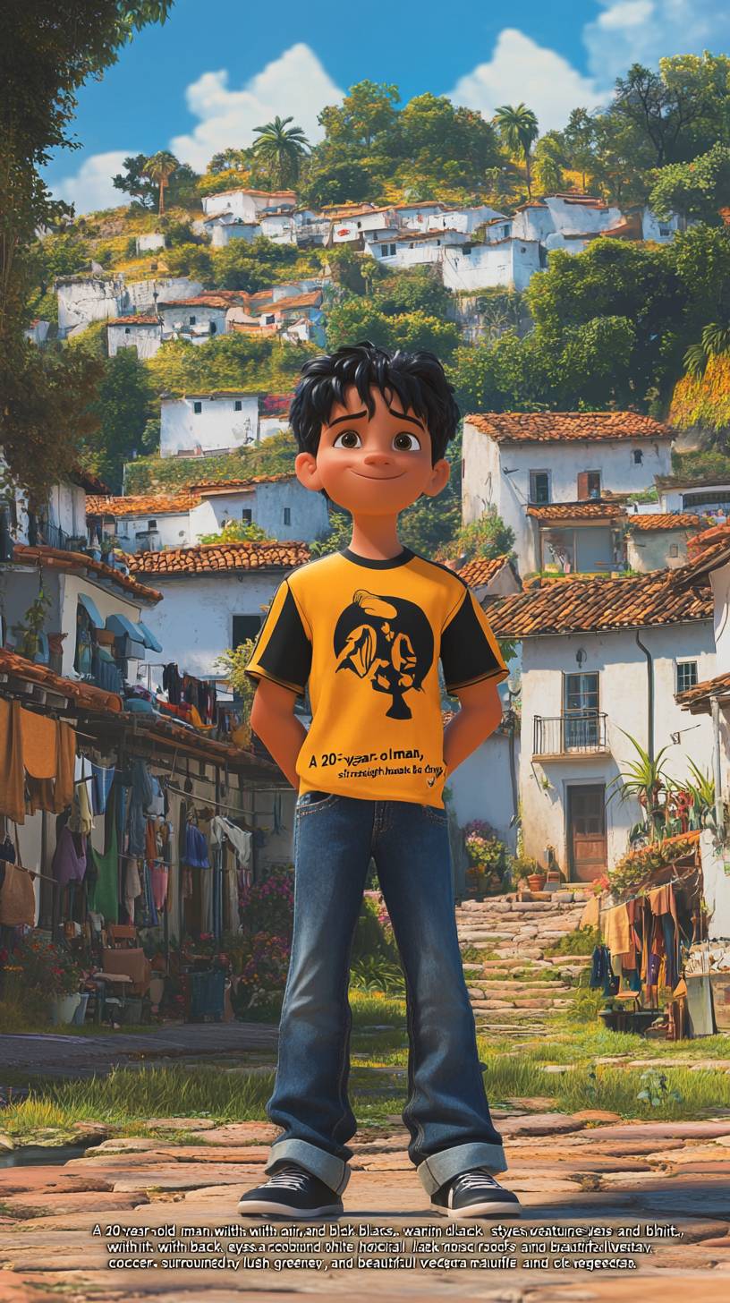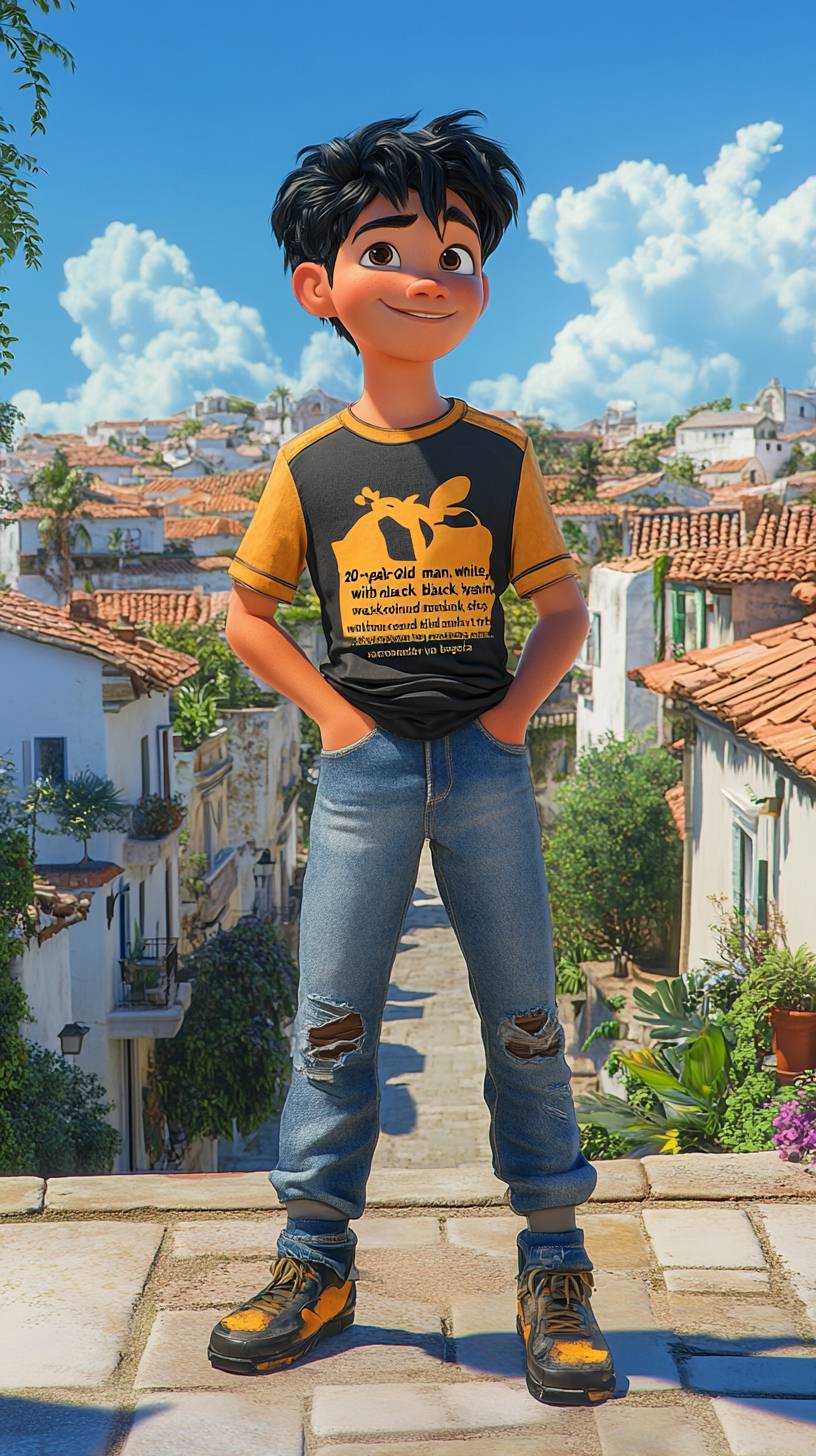"A 20-year-old man, white, with black straight hair and black eyes, wearing denim jeans and a yellow and black soccer-style t-shirt. The background features a colonial area with white houses and tiled roofs, surrounded by lush greenery and beautiful vegetation. The scene should be in a Pixar-style: bright, colorful, with smooth textures and an animated look, capturing a friendly, warm, and whimsical atmosphere." --ar 9:16 --stylize 200 --v 6.1