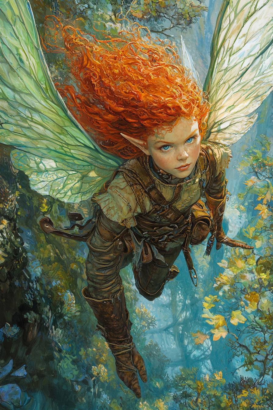 Une petite fée magique avec des ailes volant dans les airs, aux cheveux roux et aux yeux bleus, portant une armure en cuir.
