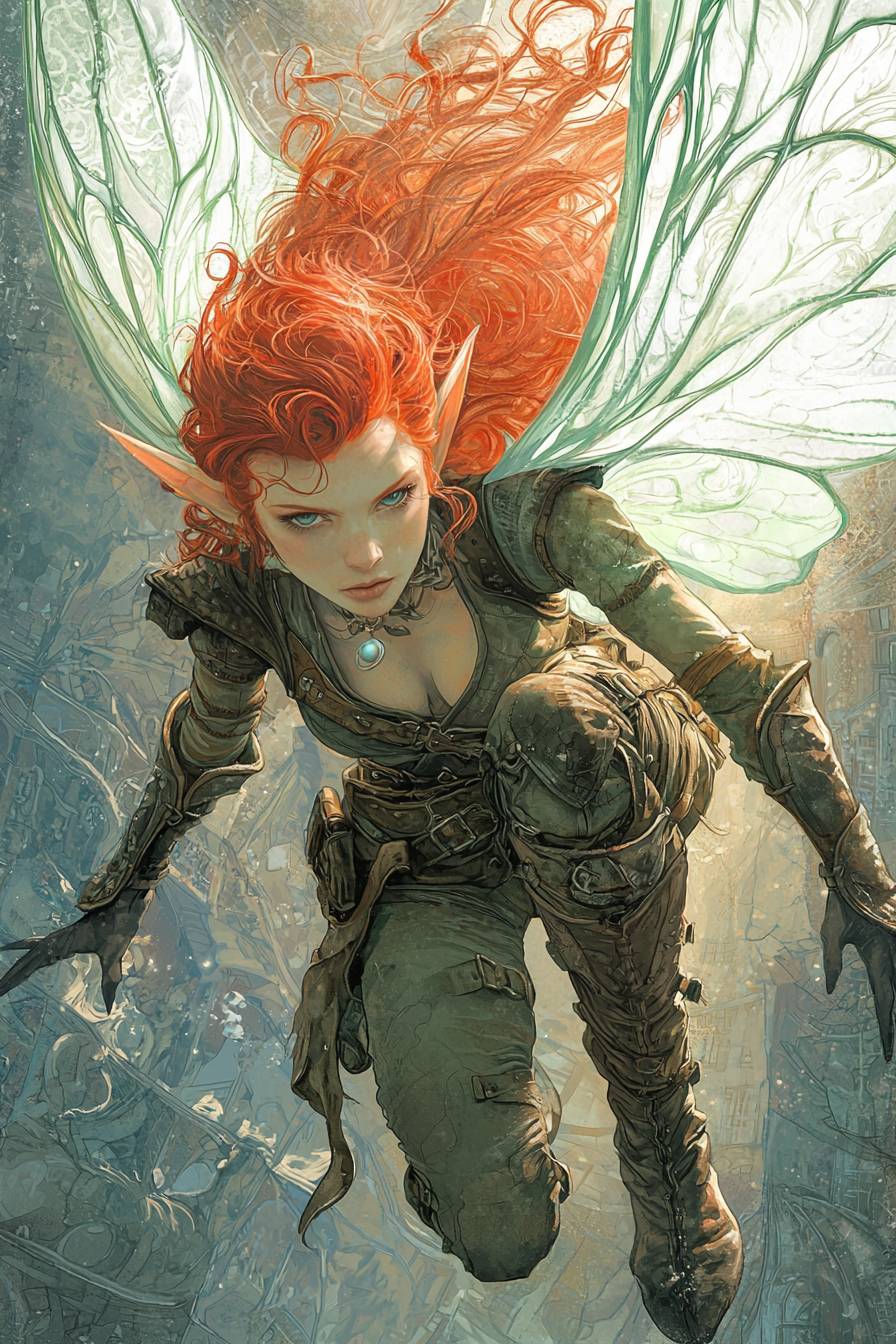 Une image en pleine longueur et en plein corps d'une petite fée sorcière ailée, magique, D&D, volant dans les airs, avec des cheveux roux soufflés par le vent et des yeux bleus, portrait en plein corps, illustration détaillée dans le style artistique fantastique de Frank Miller et Rebecca Guay. La fée a des ailes vert clair luminescentes et porte une armure en cuir. L'image présente des couleurs vives et un éclairage cinématographique, créant un effet ultra-réaliste.