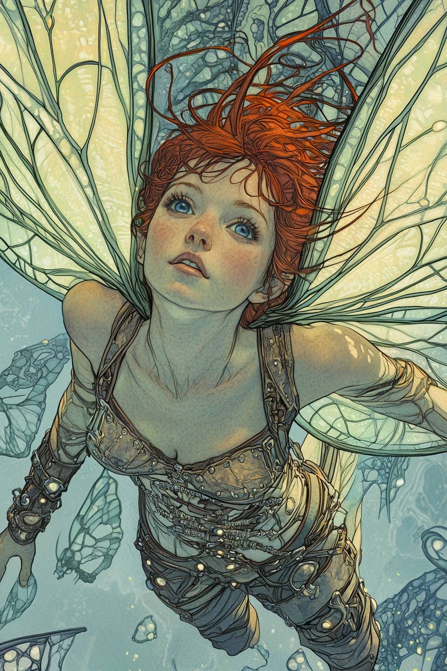 full-length, full-body image of a tiny winged sorcery fae faerie fairy, magical, D&D, flying in the air, with windblown red hair and blue eyes, full-body portrait, detailed illustration in the fantasy art style of frank miller + rebecca guay. The fairy has luminescent light green wings and is wearing leather armor. The image features vibrant colors and cinematic lighting, creating an ultra-realistic effect. --chaos 5 --ar 2:3 --quality 2 --v 6.1