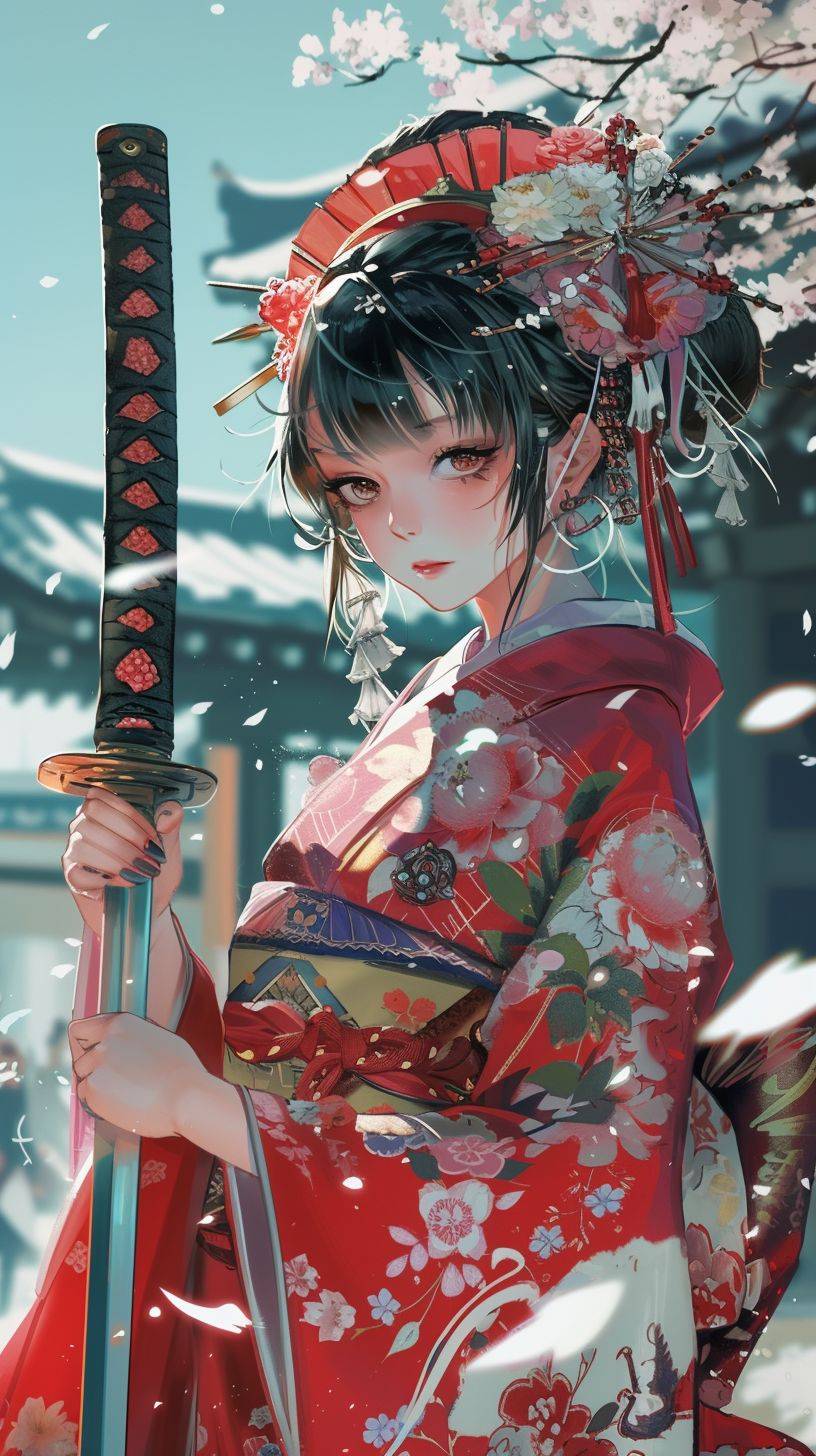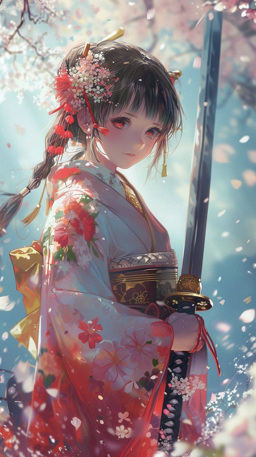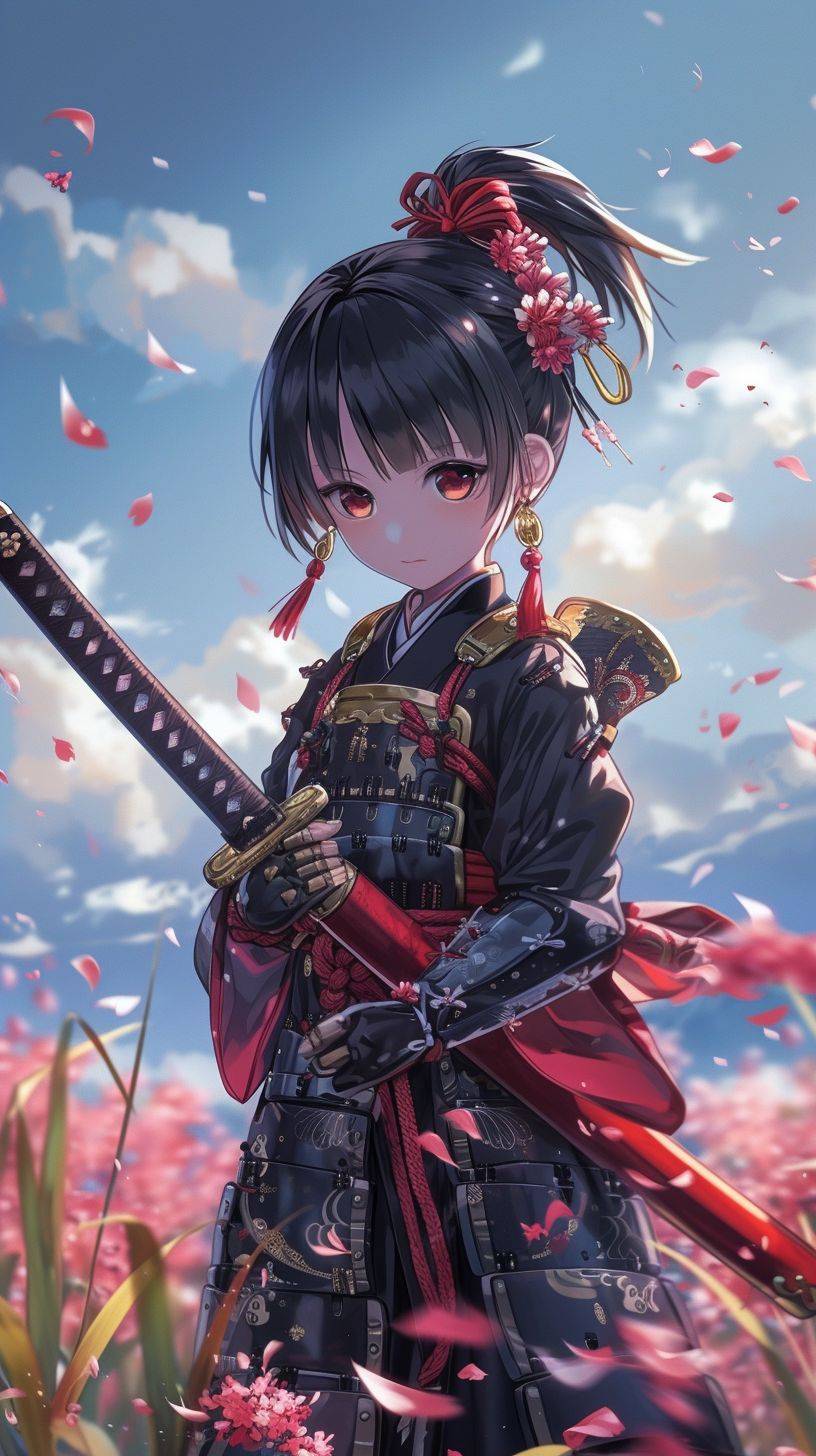 Un fond d'écran mignon d'une fille samouraï dans un style japonais kawaii.
