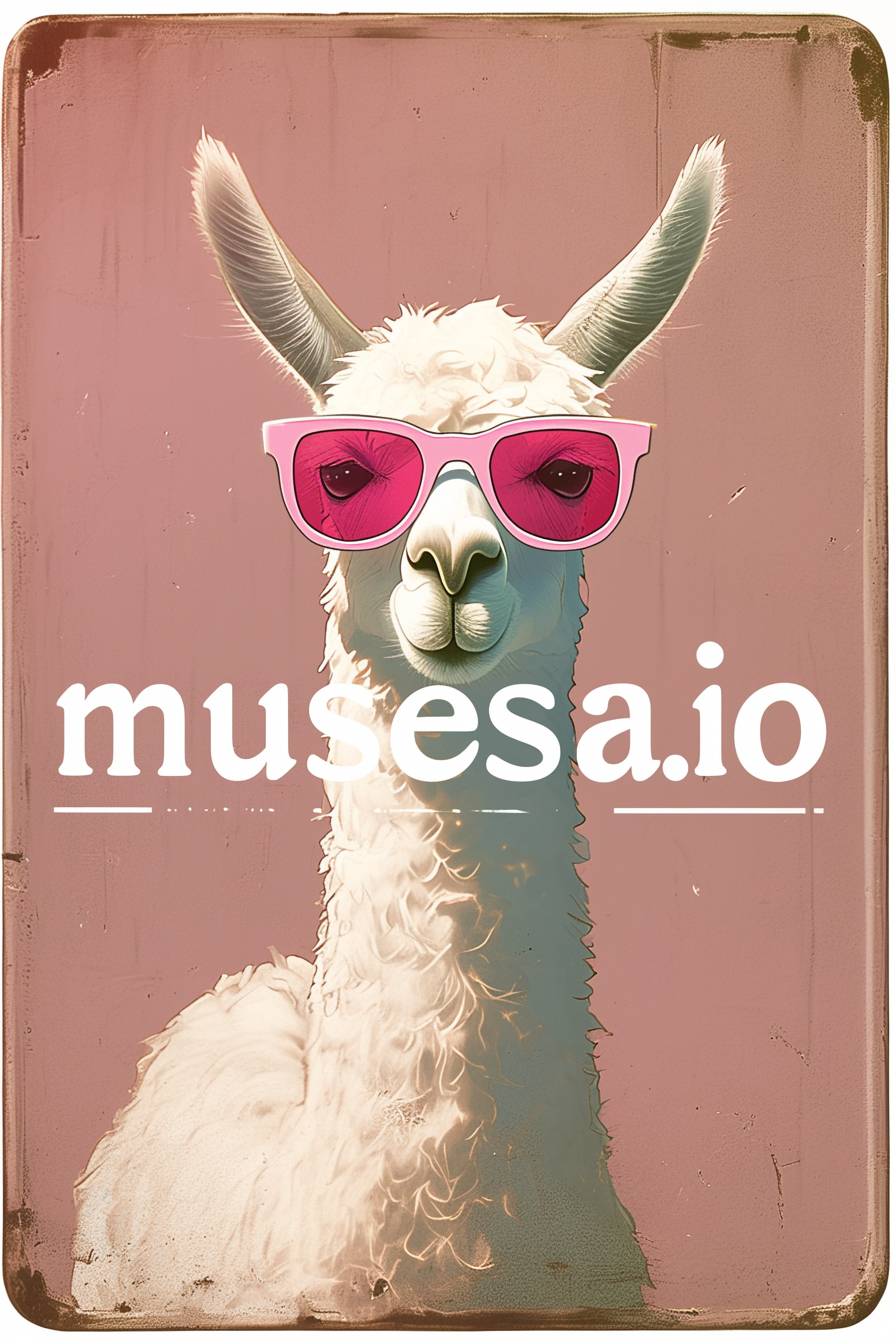 Une photo d'un ancien panneau en métal blanc avec le texte 'musesai.io', une lama portant des lunettes de soleil roses, sur un fond rose, dans un style clipart, avec une bordure blanche.