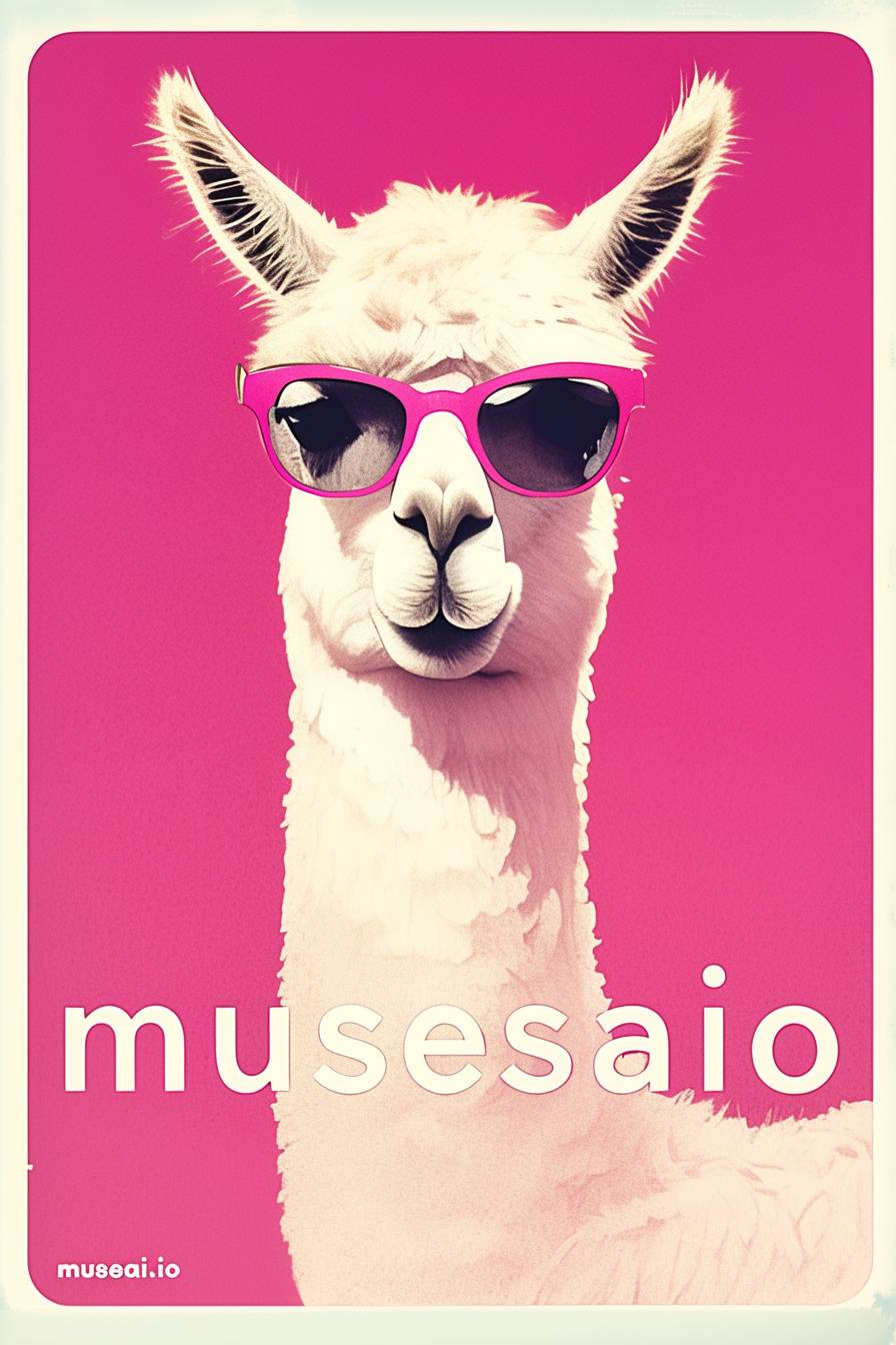 Une photo d'un vieux panneau en métal blanc avec le texte 'musesai.io', une lama portant des lunettes de soleil roses sur un fond rose.
