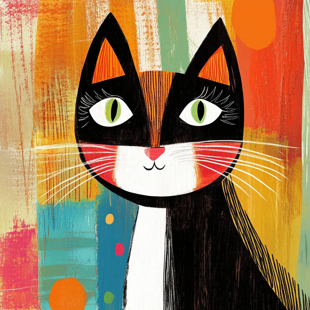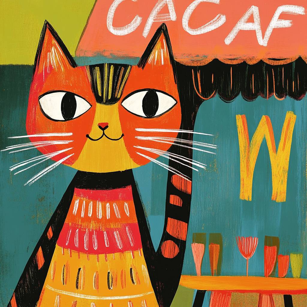 Logo de café pour chats simplement minimaliste, dessiné à la main par un enfant au crayon de cire