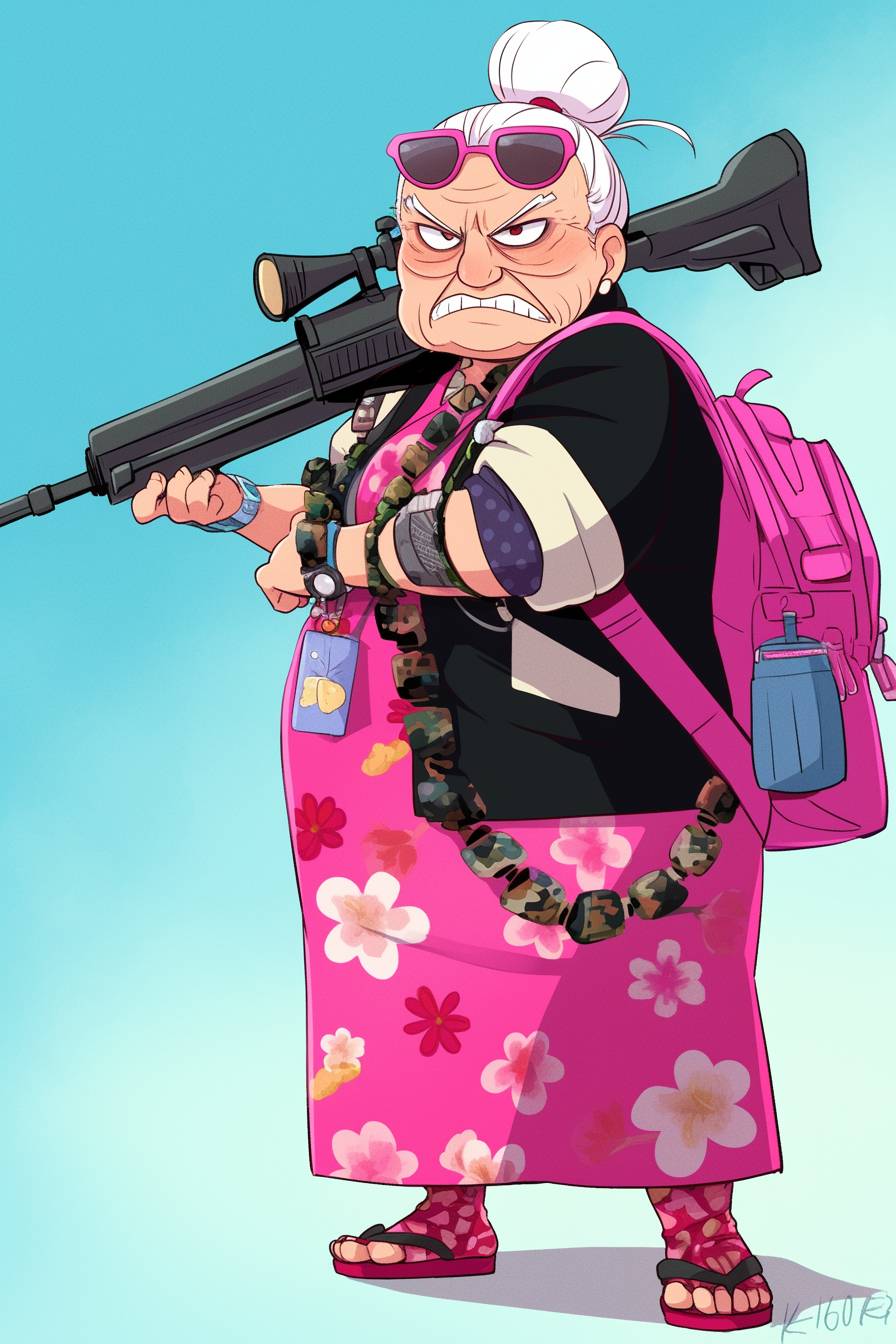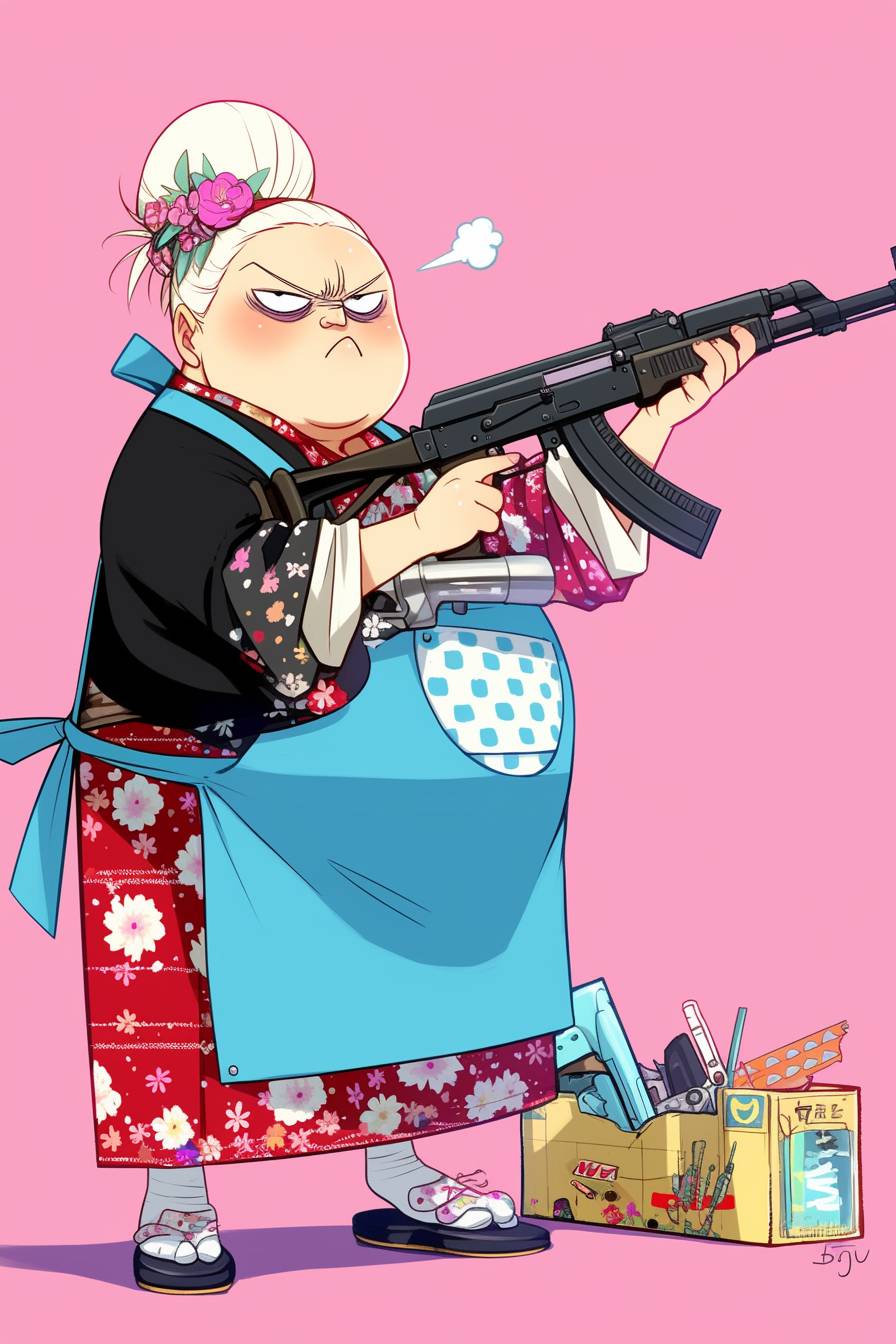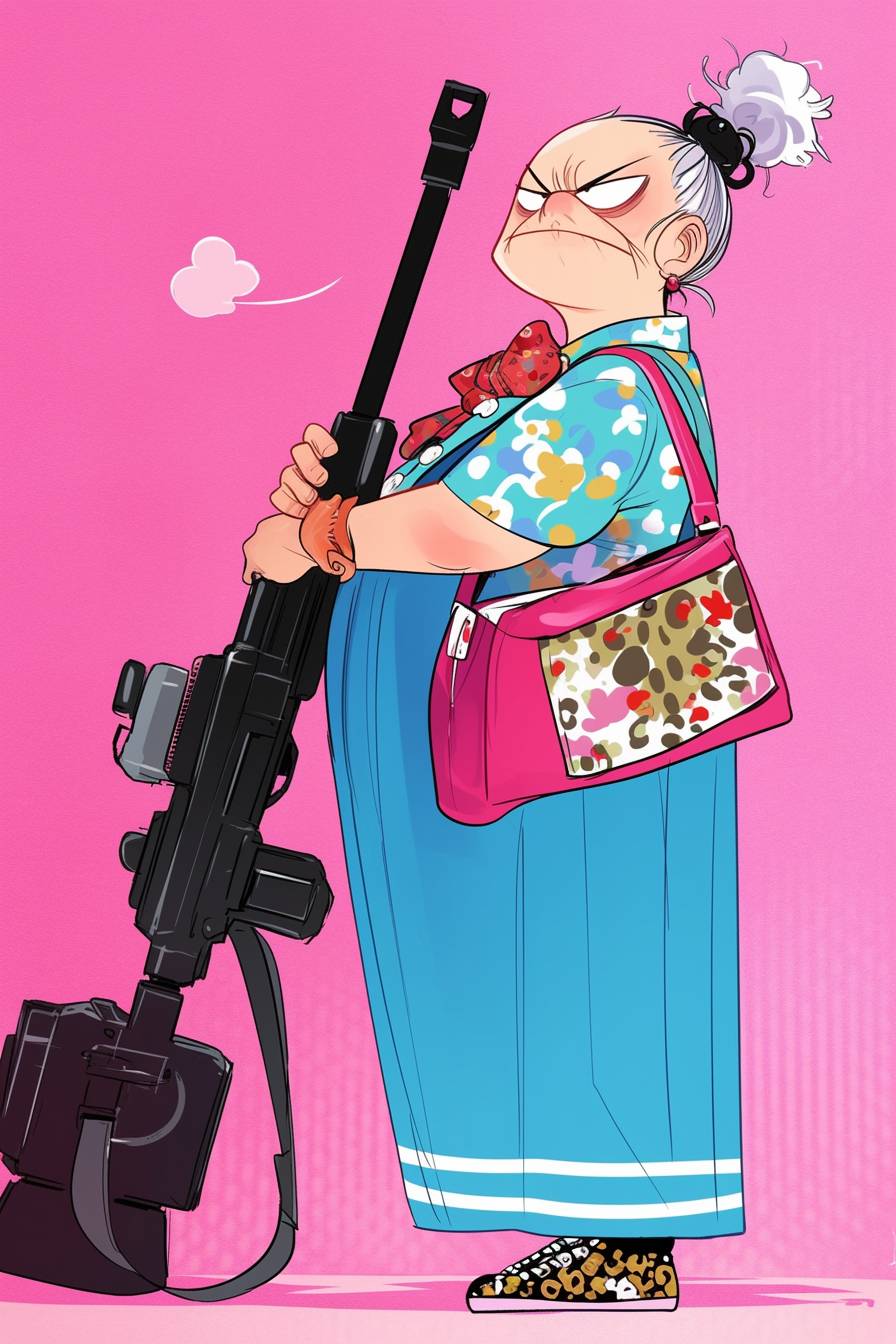 Une vieille dame en colère et en surpoids, avec une mitrailleuse surdimensionnée.