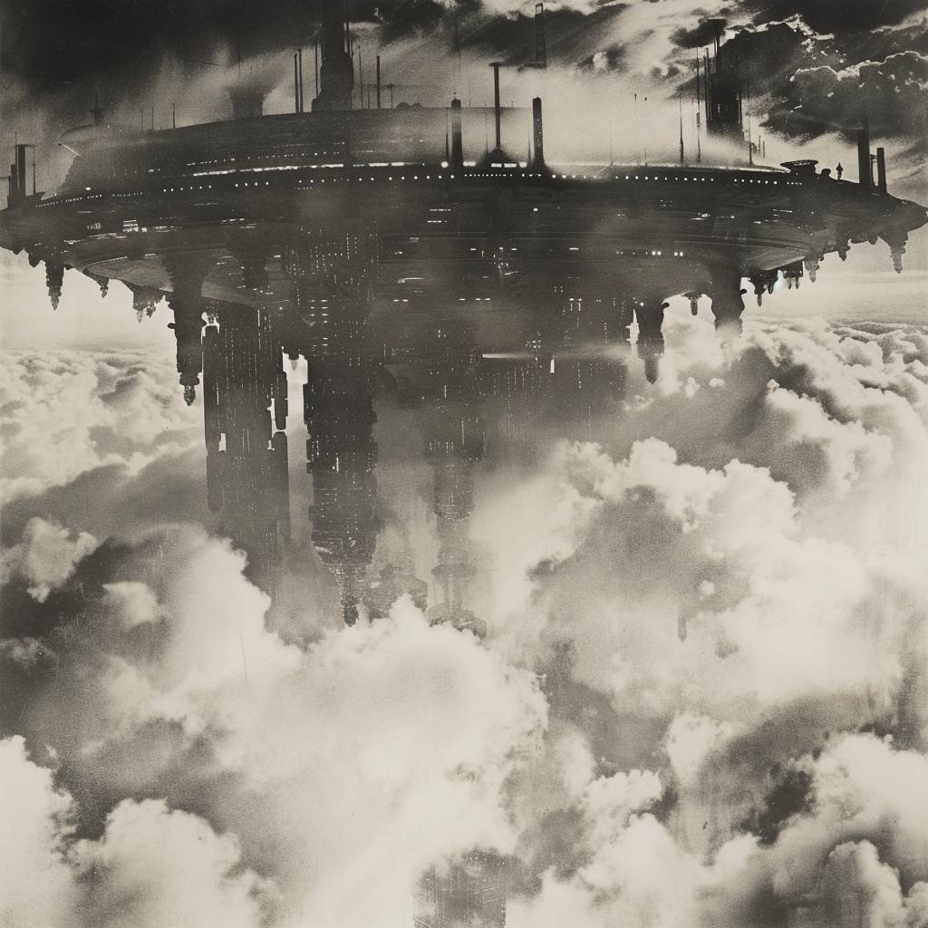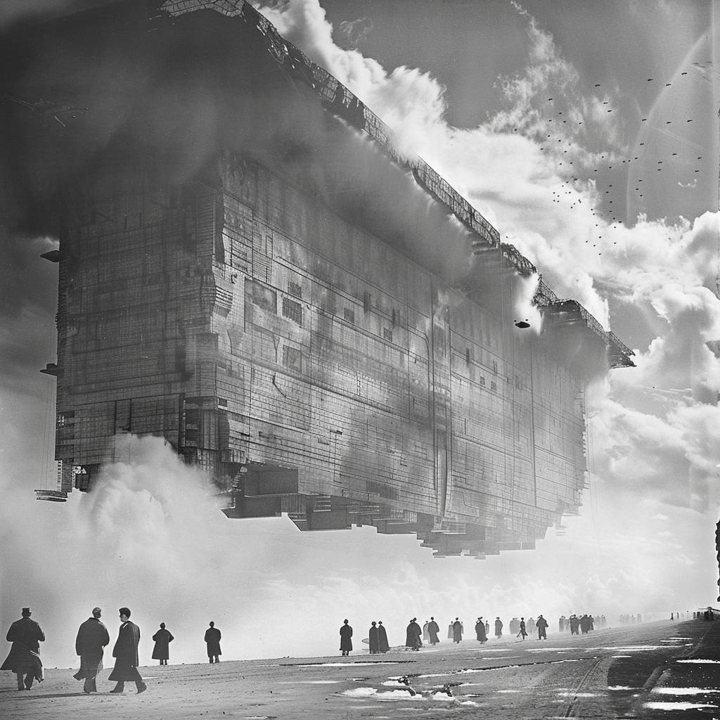Margaret Bourke-White's photograph of enormous Doomsday megastructure floating in clouds. Colossal scale. Central composition --v 6.0