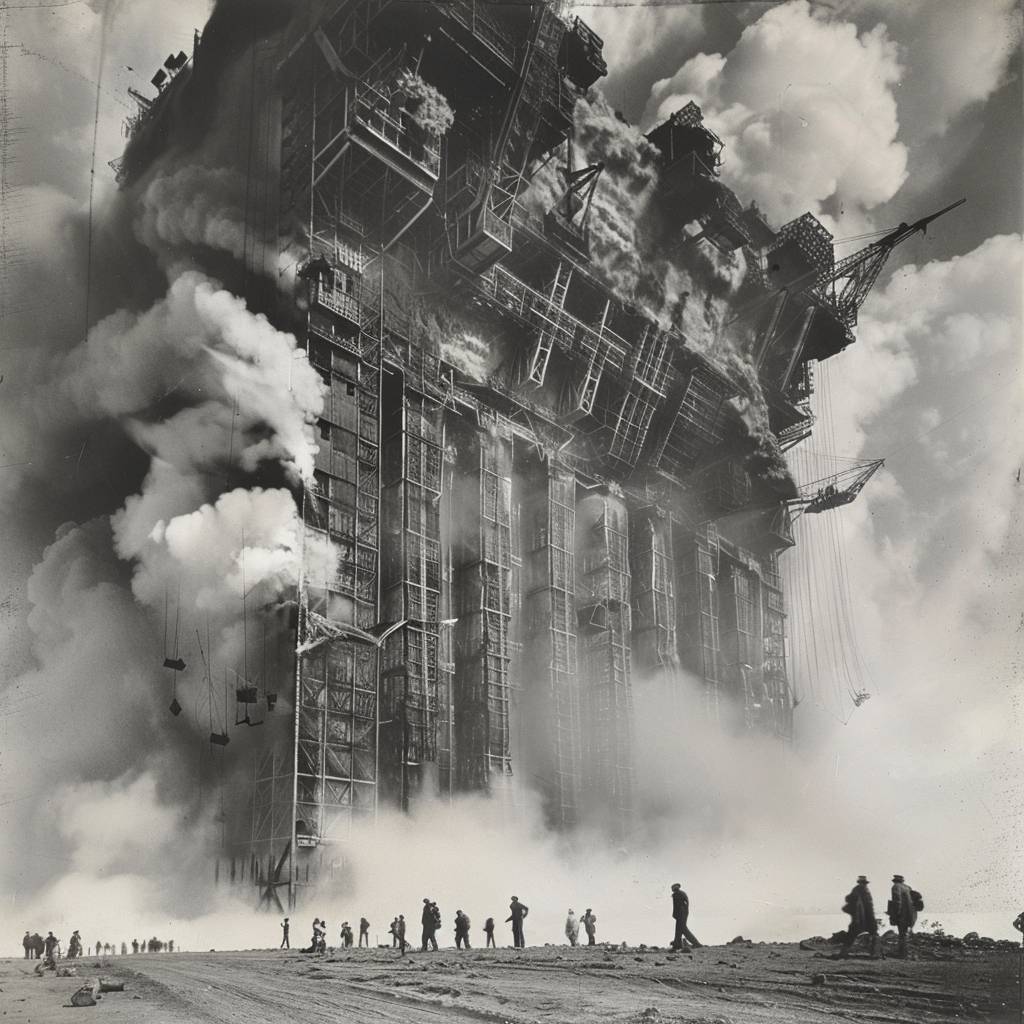 La photographie de Margaret Bourke-White d'une énorme mégastructure du Jugement dernier flottant dans les nuages. Échelle colossale. Composition centrale.