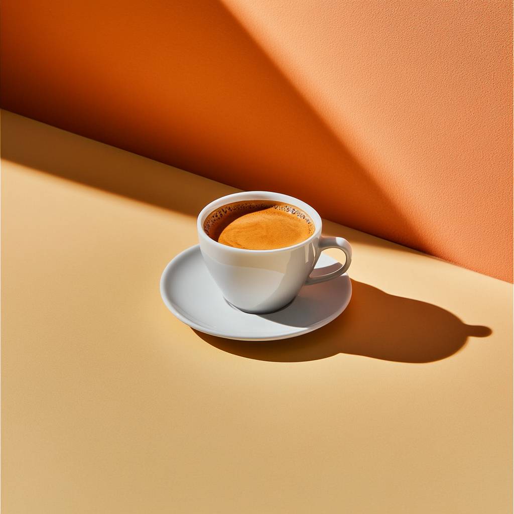 Photo produit d'un espresso, arrière-plan de couleur unie lumineuse, éclairage lumineux similaire aux marques contemporaines de vente directe aux consommateurs.