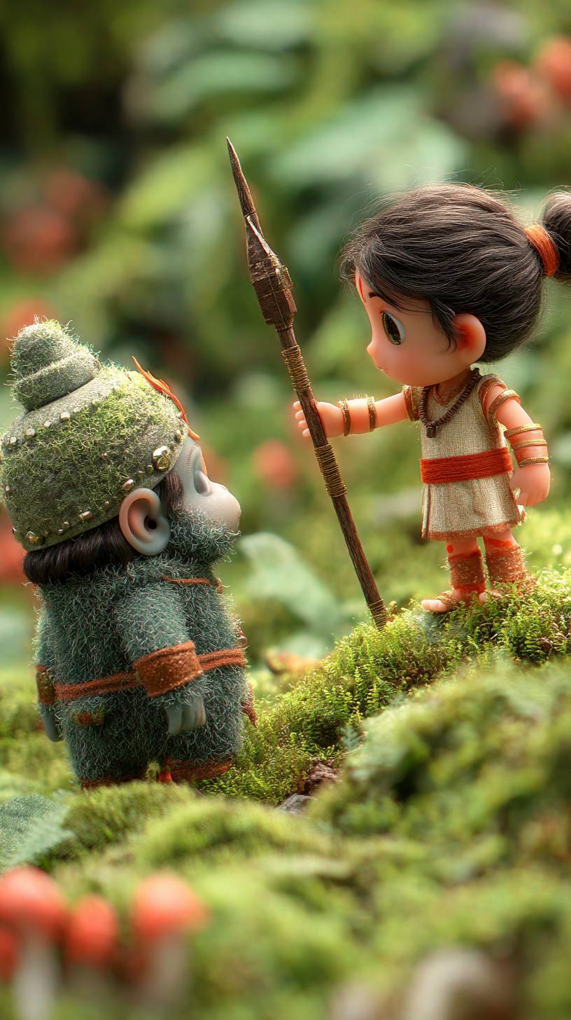 Tiny Little Lord shree Ram, meeting with Lord hanuman in jungle, 3D Pixar animation quality, like toy story feel, --ar 9:16 --stylize 250 --v 7.0