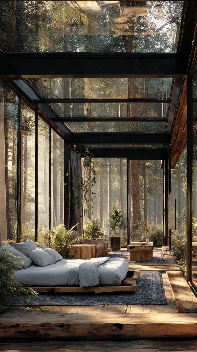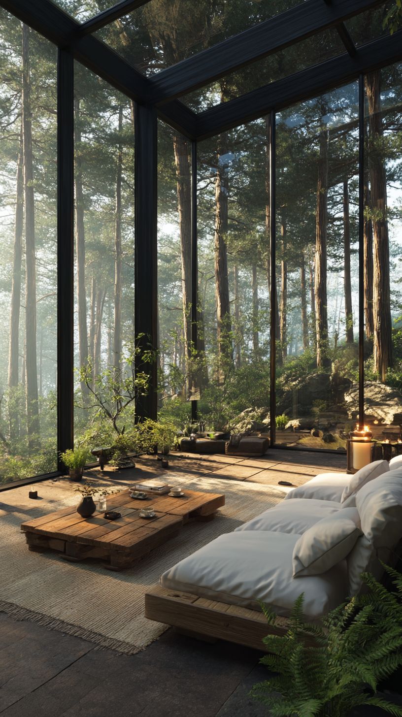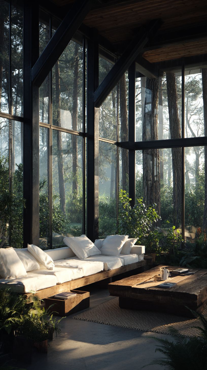 view Hyper-realistic interior a of a Mirrored Eco-Cabin nestled in a pine forest: floor-to-ceiling glass walls seamlessly reflecting The surrounding Trees, A Minimalist wooden platform sofa with crisp white linens, a low natural-wood coffee table, Soft area rug, 8K resolution, black steel beams framing The space, morning sunlight filtering through the canopy, 16:9 2, Ultra-detailed architectural Photography, lighting Warm ambient, serene atmosphere, potted ferns and eucalyptus --ar 9:16 --v 7.0