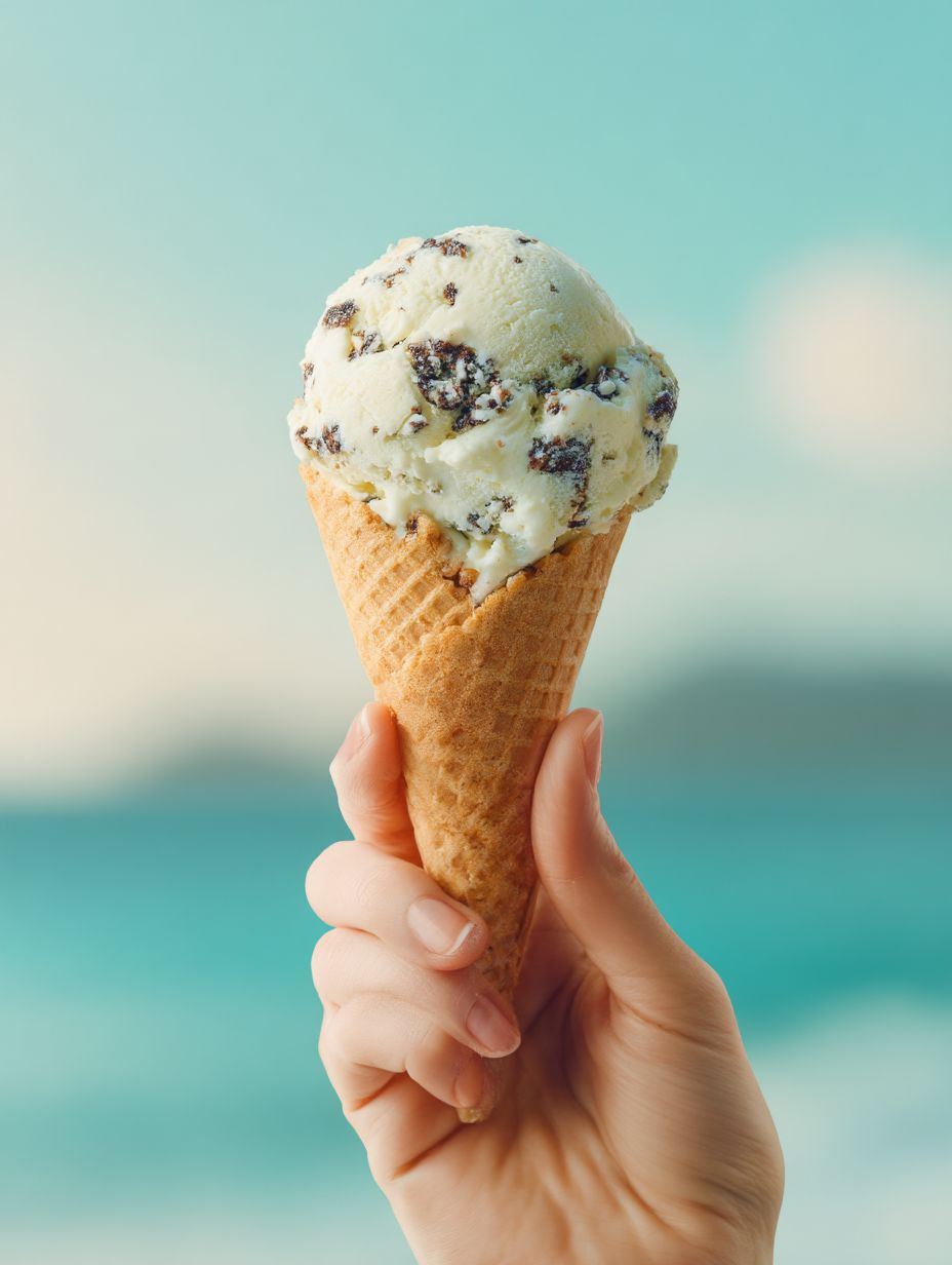 Une photo de style de vie hyper-réaliste dans un cadre estival français joyeux et légèrement vintage. Une main de femme tient un cornette de glace avec une boule de stracciatella, mettant en valeur des morceaux de chocolat visibles et une texture crémeuse. L'arrière-plan présente des tons turquoise pastel doux, évoquant une ambiance côtière calme et élégante. L'image a une esthétique propre et fraîche, avec un subtil charme vintage des années 60, un éclairage naturel doux et un accent sur les textures et l'ambiance. La scène est chaleureuse, nostalgique et raffinée.
